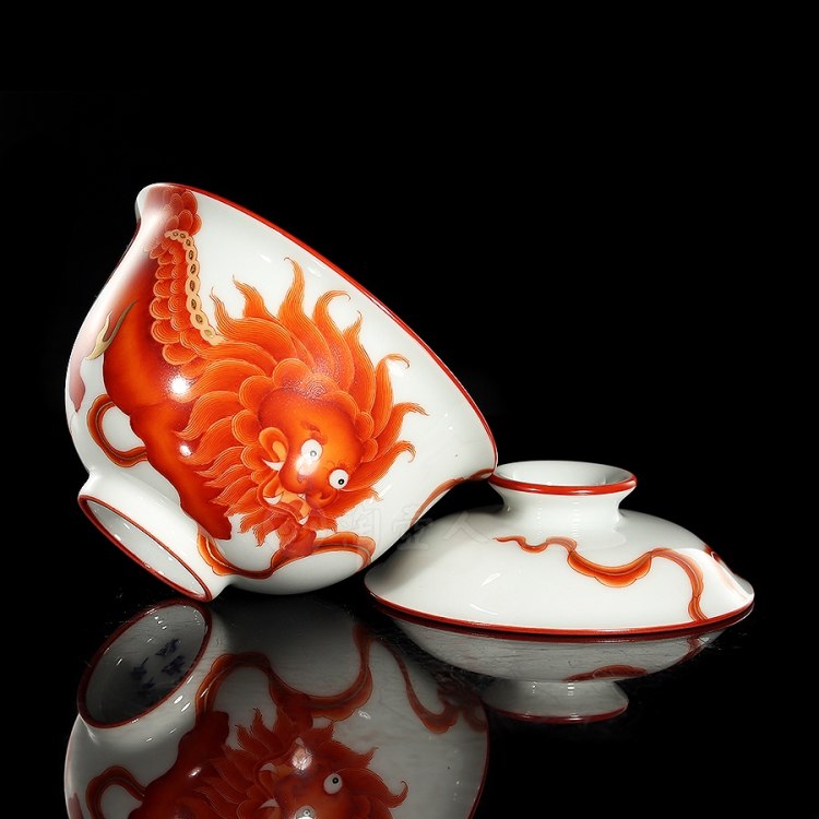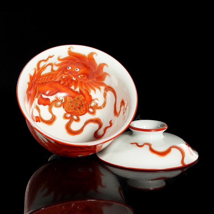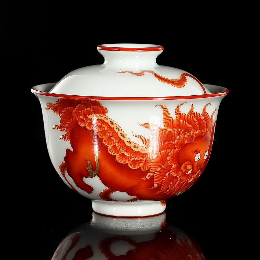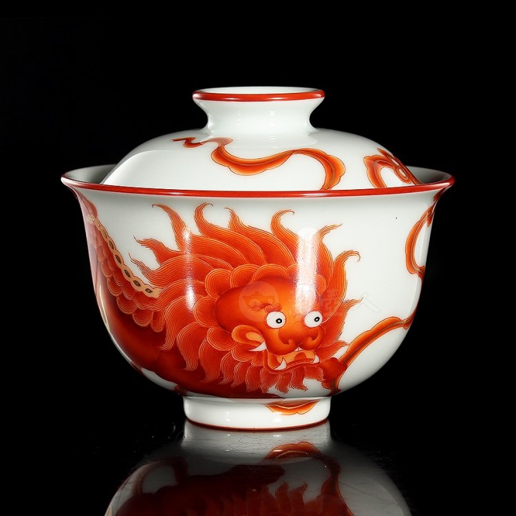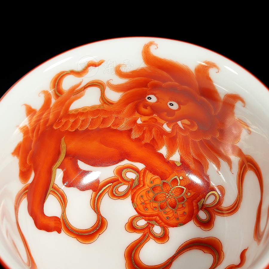 首页 景德窑 梁峻窑制《狮戏绣球盖碗(矾红.大)》