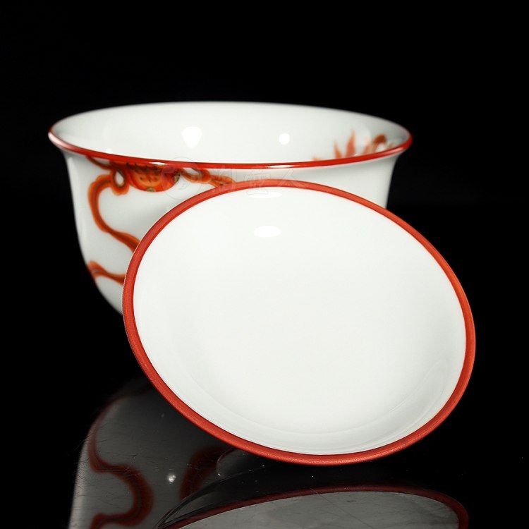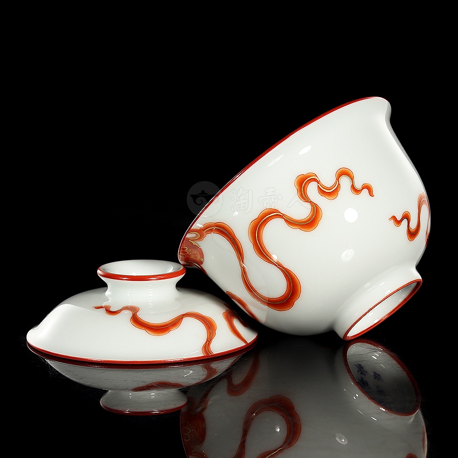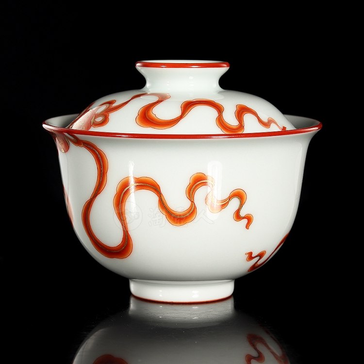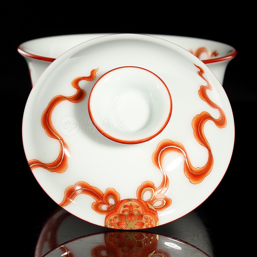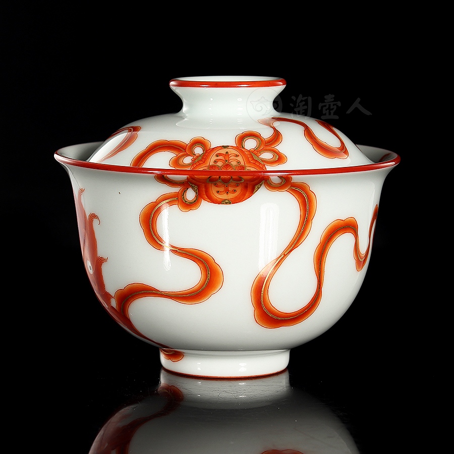 首页 景德窑 梁峻窑制《狮戏绣球盖碗(矾红.大)》