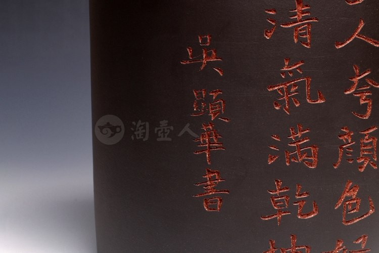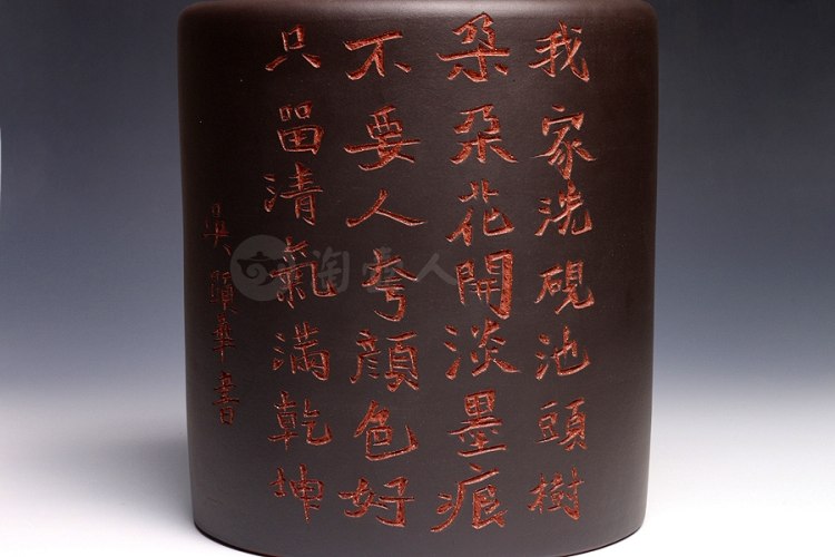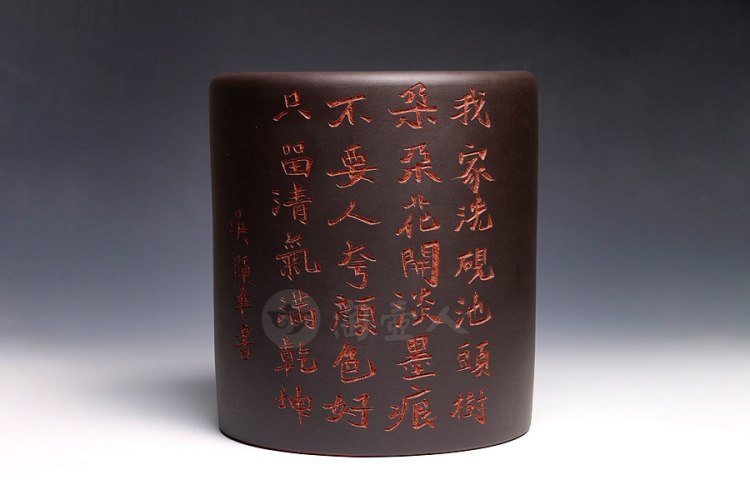 笔筒二刻“我家洗砚池头树,朵朵花开淡墨痕。不要人夸颜色好,只留清气满乾坤。”落款“吴显华书”。