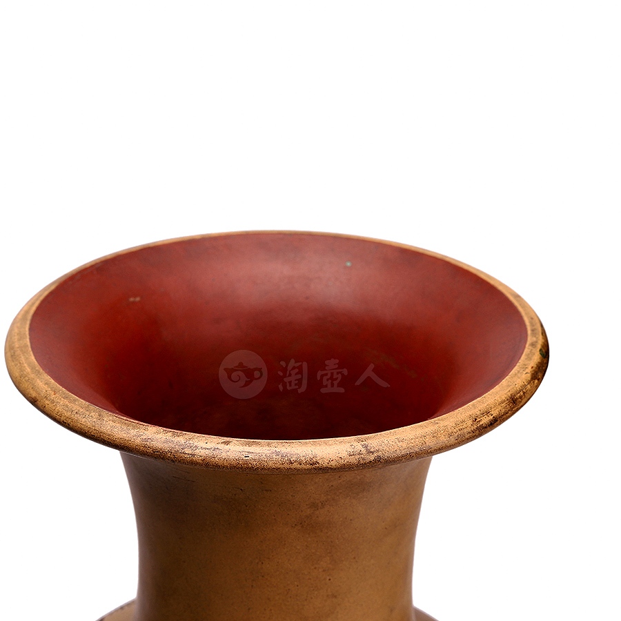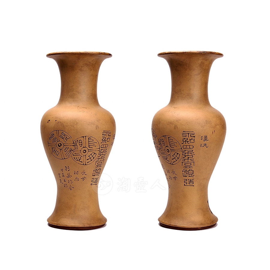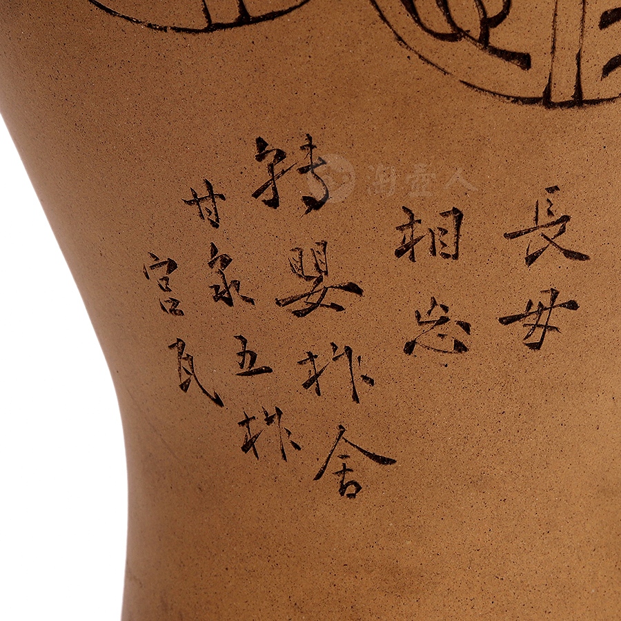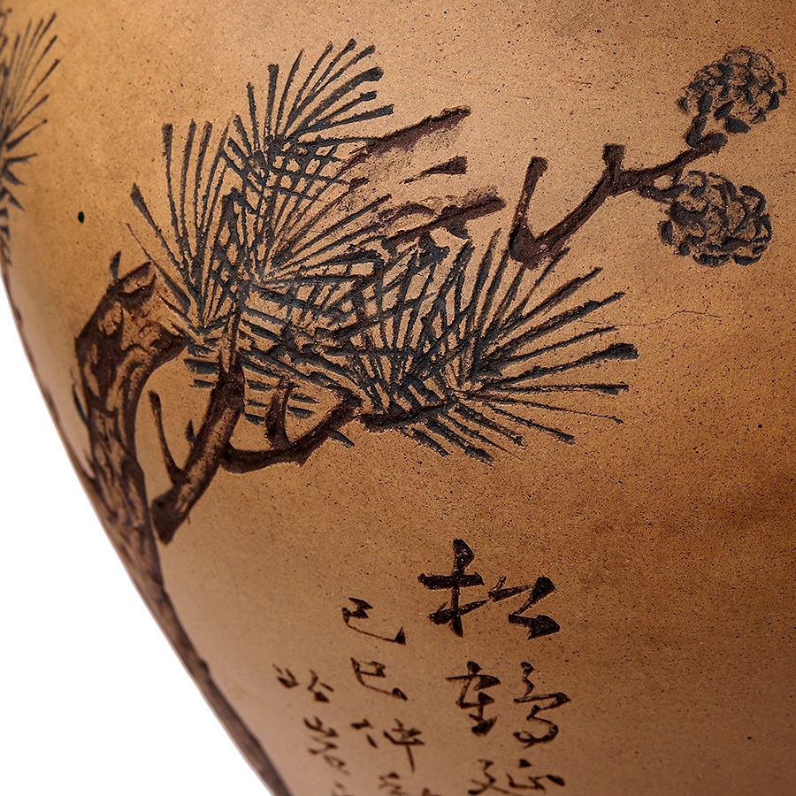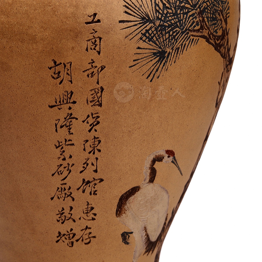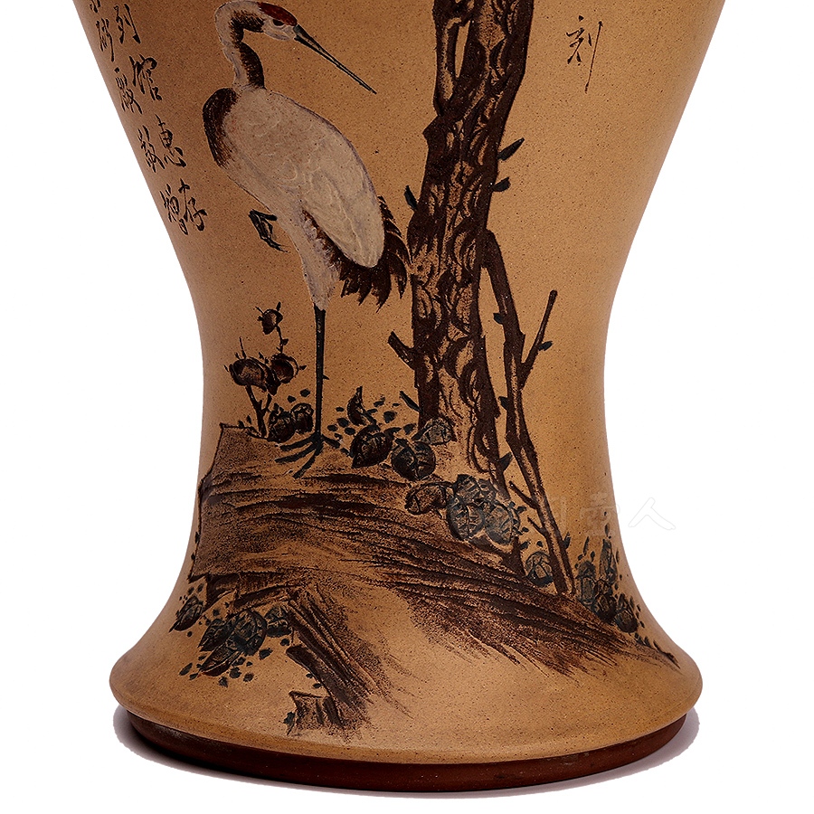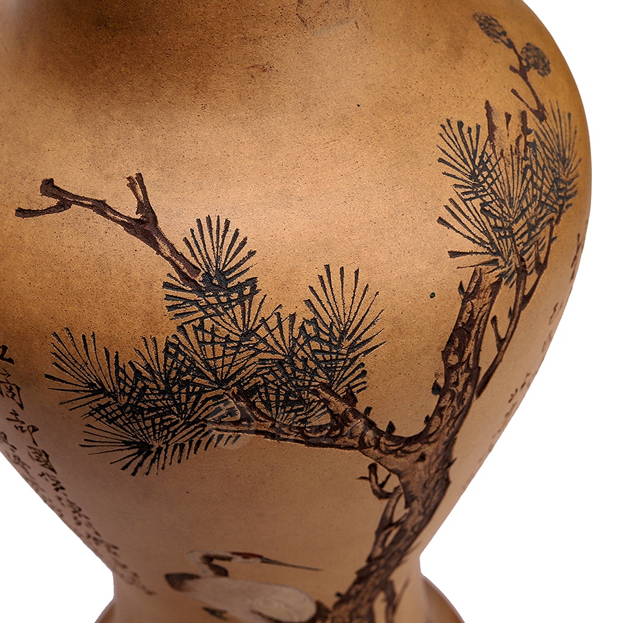 此作品圆口外撇,细长颈收束,丰肩,下腹部收进入足,整器器形弧线优美、柔润自然。原矿清水泥段泥作胎,器形硕大且胎体坚实细腻,构图饱满,绘仙鹤停驻于松间,笔意写实,兼工带写。松鹤是长寿的象征,因此深受人们喜爱。此作描绘一只在松下独立的鹤,鹤的造型沈稳、宁静、生动,鹤颈弯曲,羽毛白皙纯洁,松树笔挺翠绿,整幅既有生动的造型,精美的书画,亦有高妙的寓意。瓶身另刻“松鹤延龄”,落款“己巳仲秋 北岩氏刻”,书画功底高超,在当时乃至如今都是十分精美的紫砂作品。
