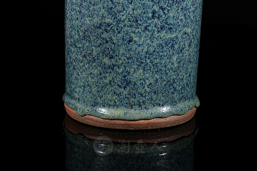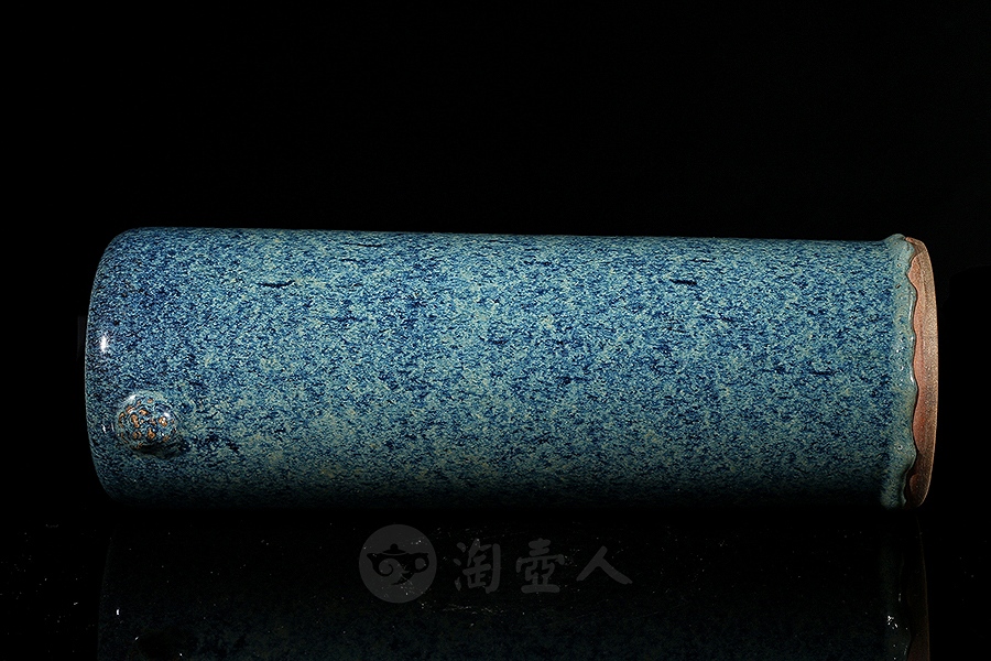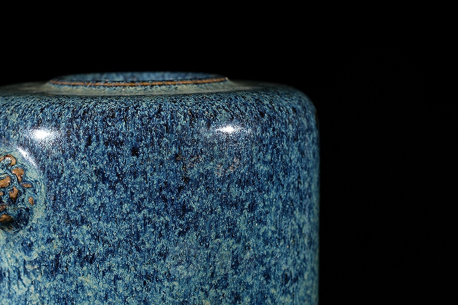 炉钧釉是清雍正时期景德镇御窑厂新创的一种仿钧低温釉,此后历朝均有烧造,盛行于雍正、乾隆时期。此种釉有施于瓷胎上者,也有施于宜兴紫砂胎上者,烧成后釉中紫红、蓝、绿、月白等色熔融一体,斑璨淋漓。清人撰《南窑笔记》曰:“炉均一种,乃炉中所烧,颜色流淌中有红点者为佳,青点次之。”炉钧釉主要以流淌的蓝釉形成自然的垂流条纹,其间密布红色或青色斑点。雍正朝炉钧釉瓷器上那种红中泛紫、似成熟的高梁穗颜色,被称之为“高梁红”。