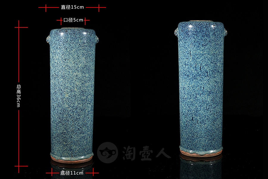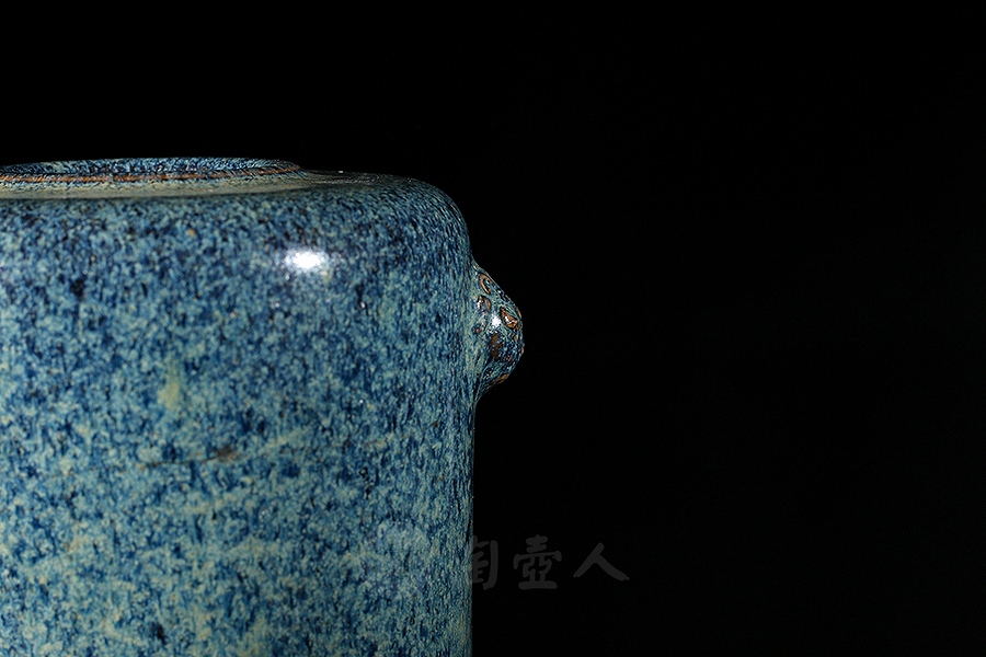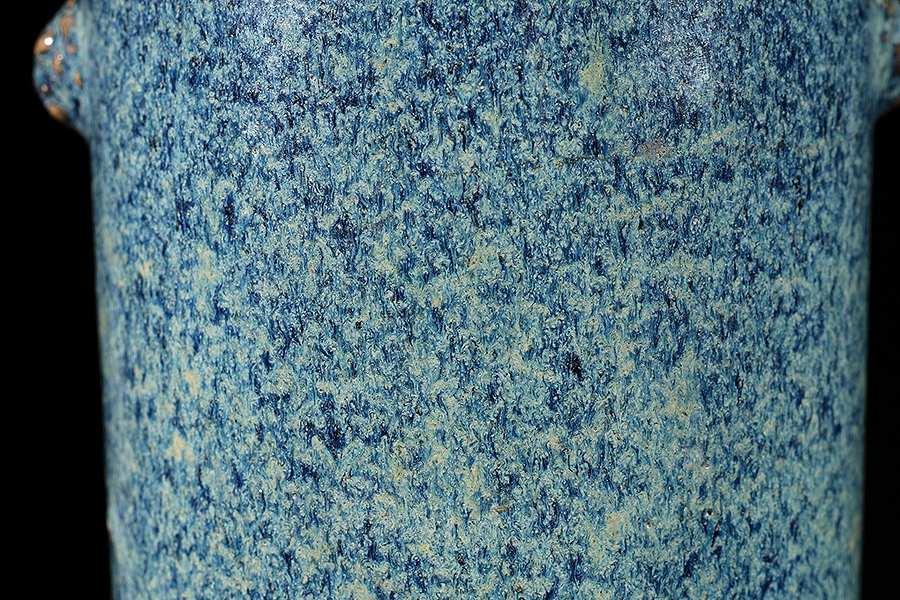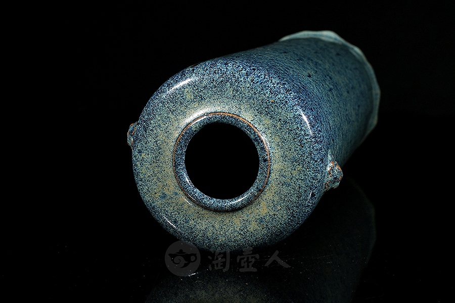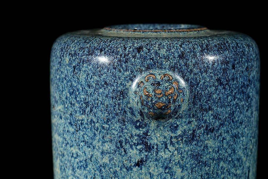 此件赏瓶尺寸颇高,器形直高而圆融,在宜钧器物中,为非常罕见的形制。瓶身上部饰有一对兽首,线条简洁,比例绝佳,气质肃穆中透出温润之感,堂皇而大雅。釉面如雪花逐浪,繁华迭丽,瓶口处钧釉酱色自然勾边,足部垂釉恰到好处,精致优雅,是件非常难得的清代文房赏瓶。