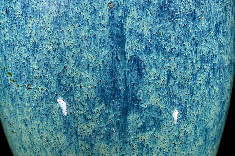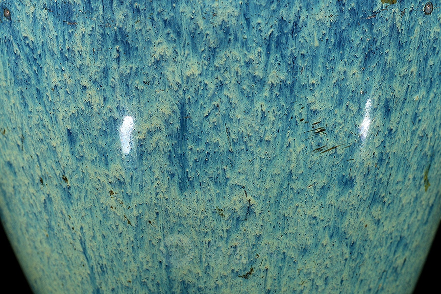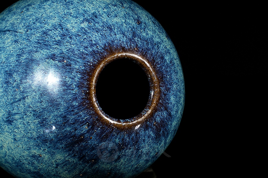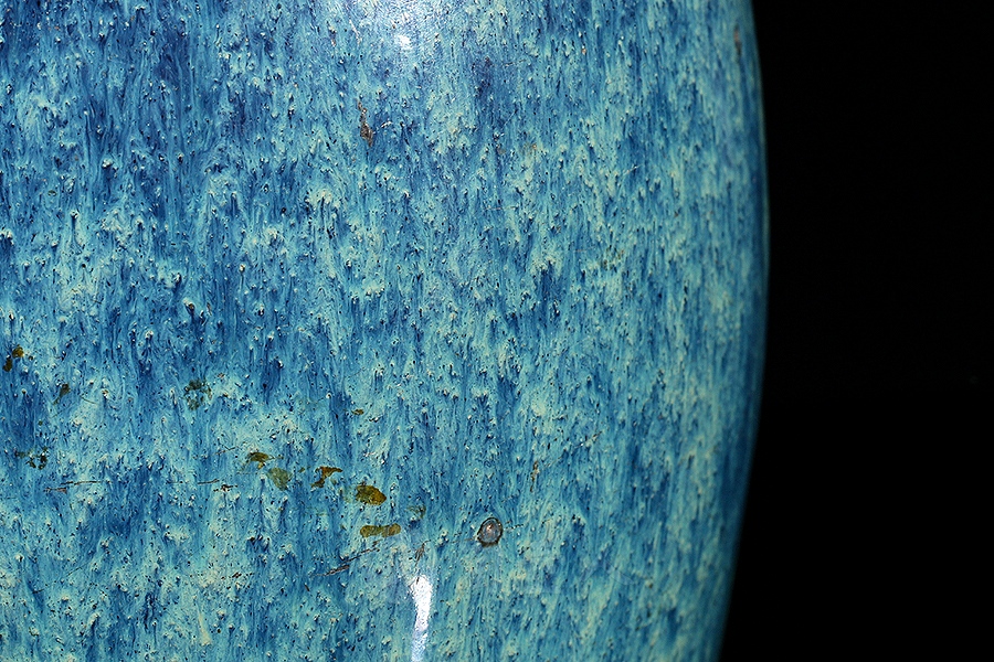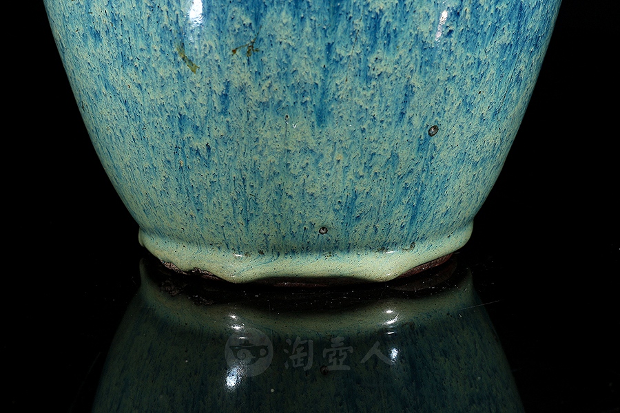 炉钧釉是清雍正时期景德镇御窑厂新创的一种仿钧低温釉,此后历朝均有烧造,盛行于雍正、乾隆时期。此种釉有施于瓷胎上者,也有施于宜兴紫砂胎上者,烧成后釉中紫红、蓝、绿、月白等色熔融一体,斑璨淋漓。清人撰《南窑笔记》曰:“炉均一种,乃炉中所烧,颜色流淌中有红点者为佳,青点次之。”炉钧釉主要以流淌的蓝釉形成自然的垂流条纹,其间密布红色或青色斑点。雍正朝炉钧釉瓷器上那种红中泛紫、似成熟的高梁穗颜色,被称之为“高梁红”。