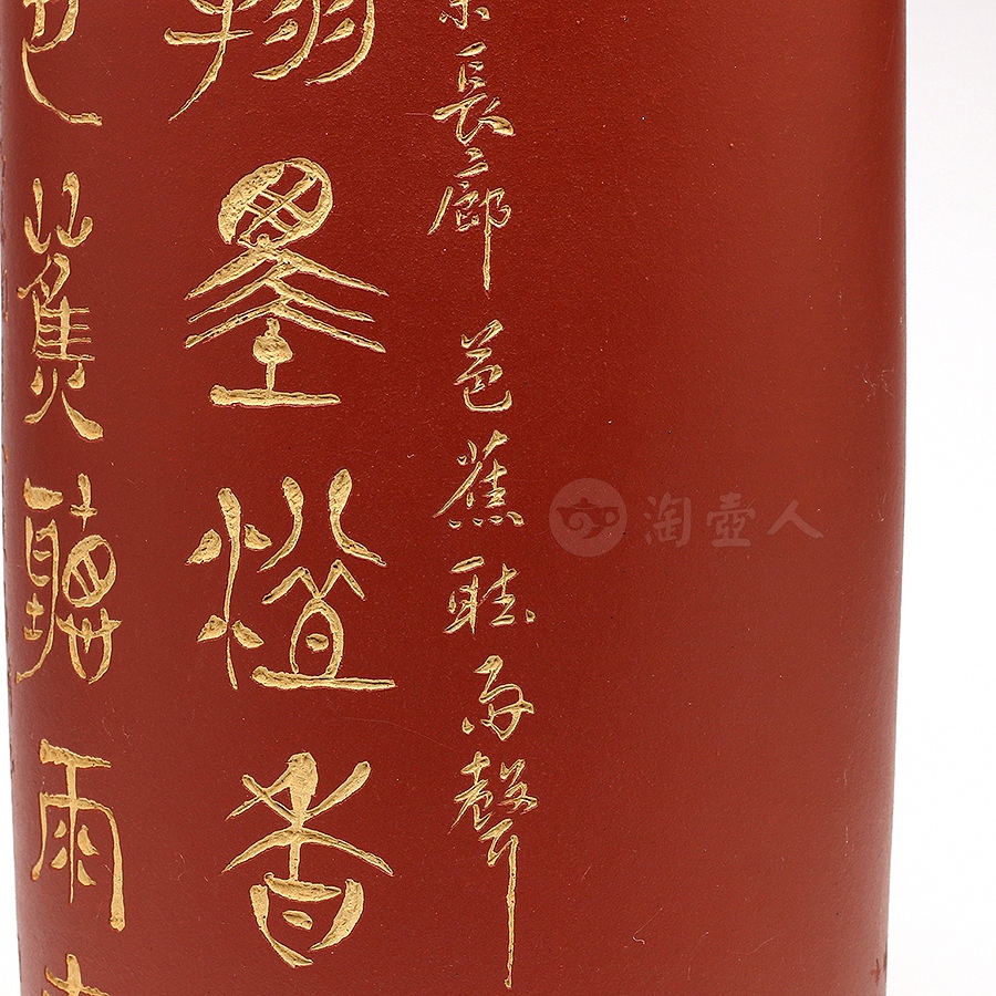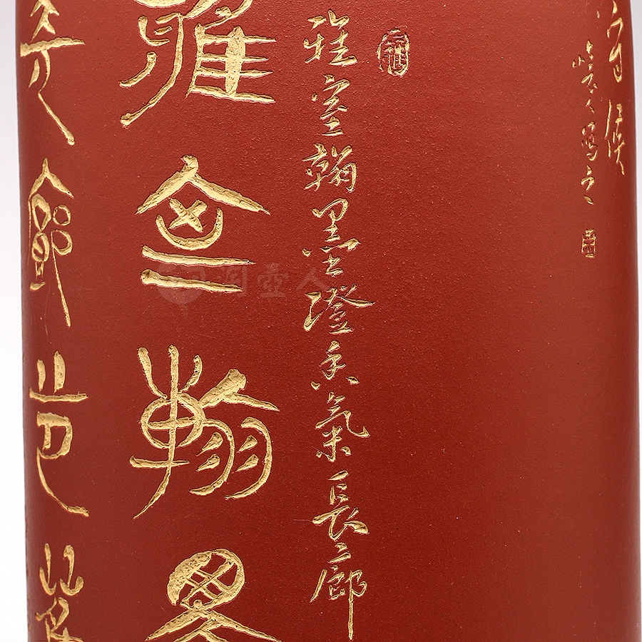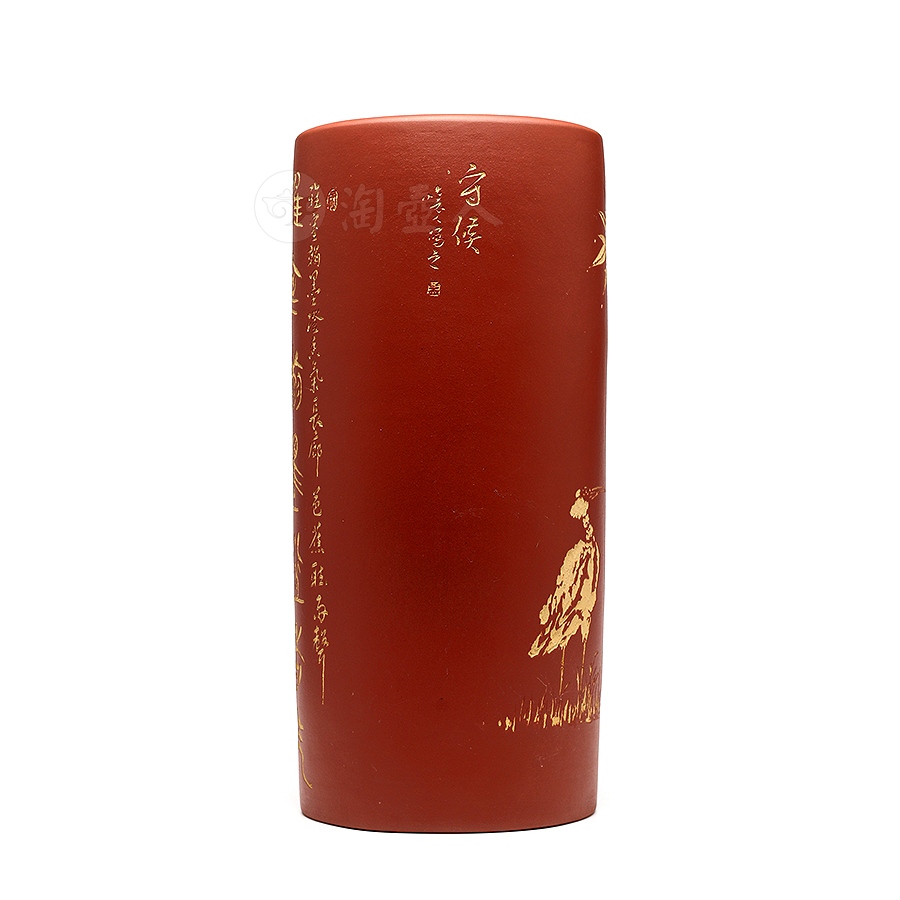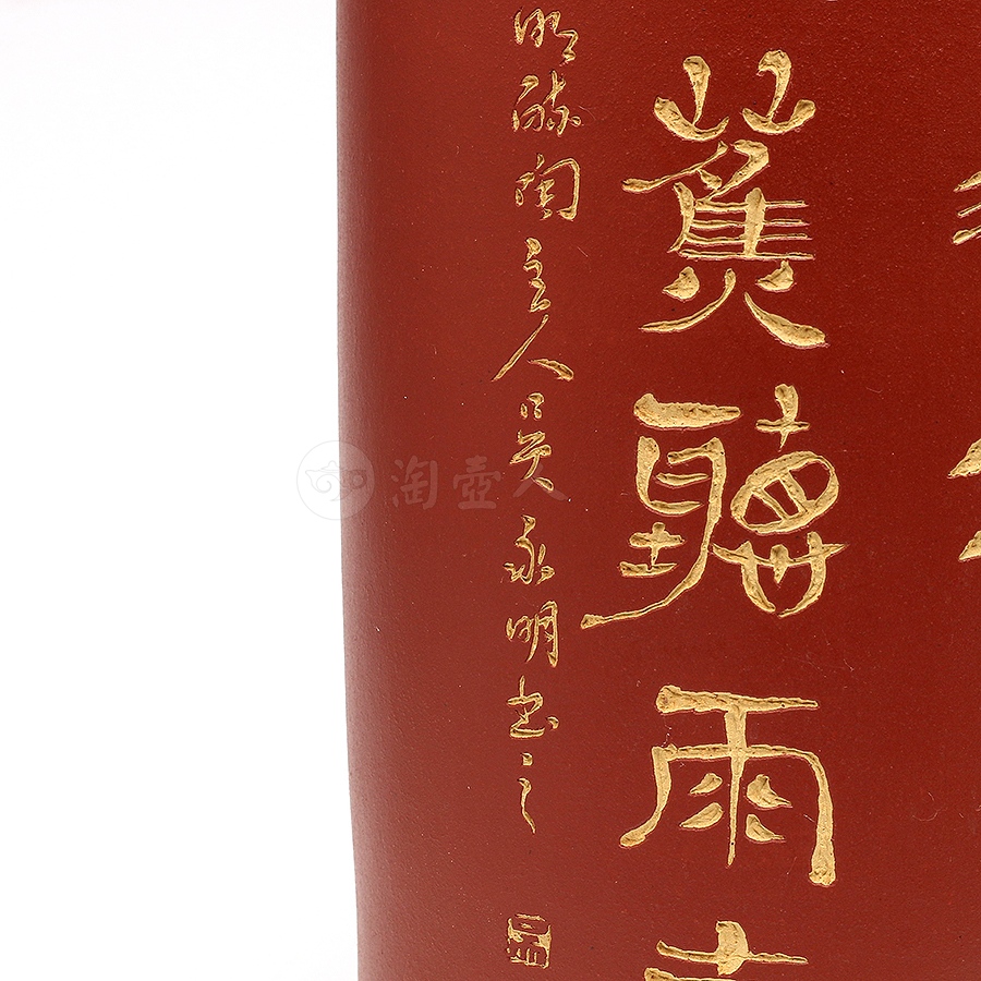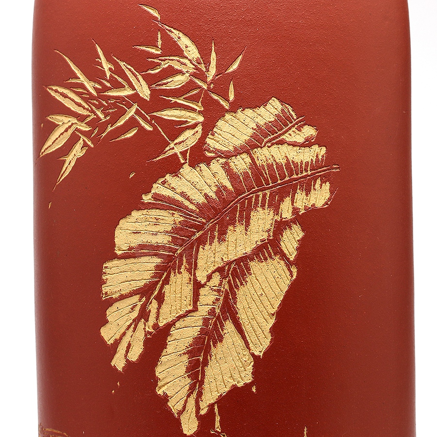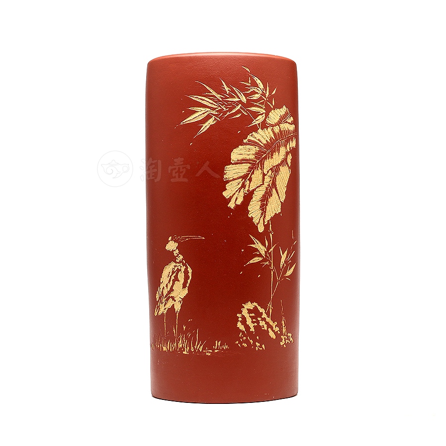 这款紫砂瓶为吴永明老师选用原矿段泥制成,瓶身正面陶刻“雅室翰墨溢香气,长廊芭蕉听雨声”,反面刻绘白鹭浅滩漫步,细碎的雨滴曳动芭蕉竹叶,诗书画韵,妙也!