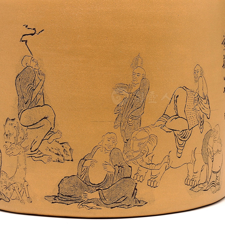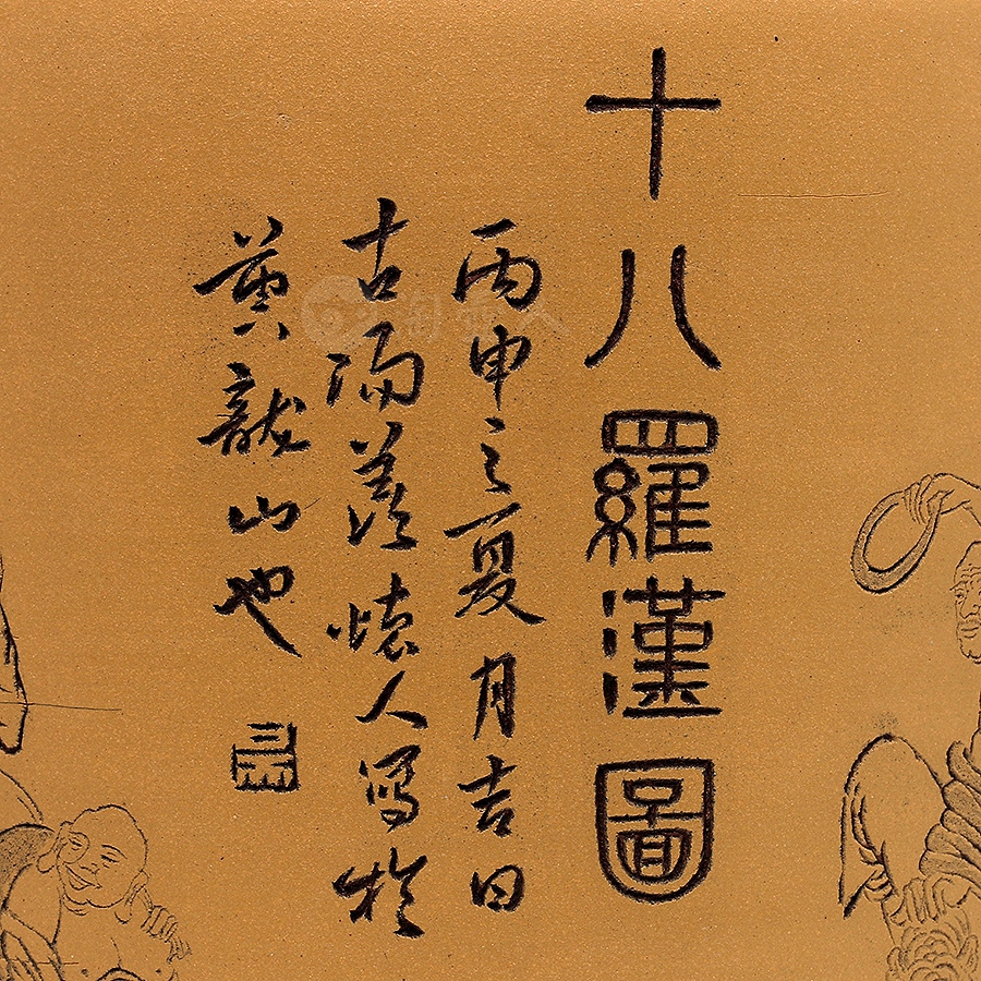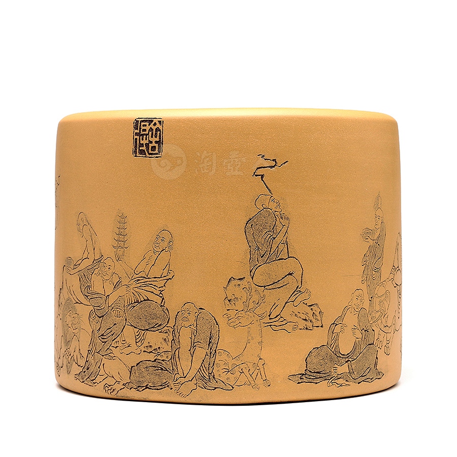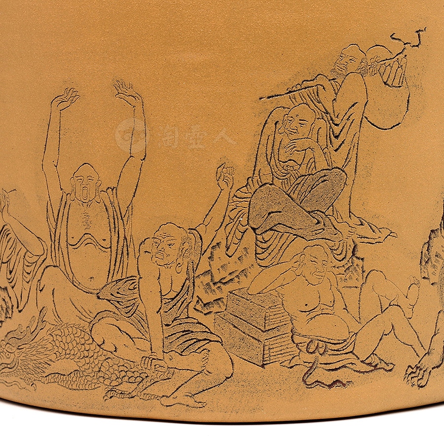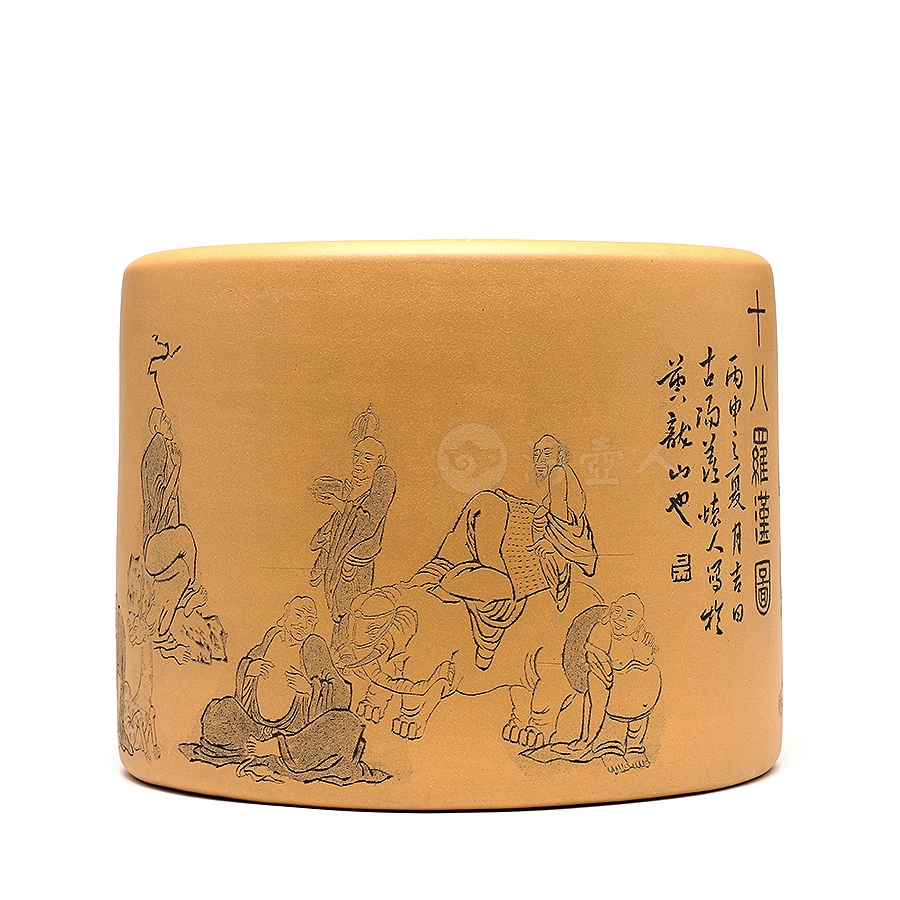 这个笔筒造型简洁,色泽清丽,加上刻绘装饰精致独到,非常增色,圆柱体外观很简练,上下线条笔挺,弧线简洁自然,内红而外黄,色调对比鲜明,更显富丽雅致,刻绘“十八罗汉笔筒 岁在丙申夏月 古阳羡怀人写与黄龙山记 ”,笔筒刻绘十八罗汉图,其线条刻绘清晰分明,品质有感,用于文房再好不过。