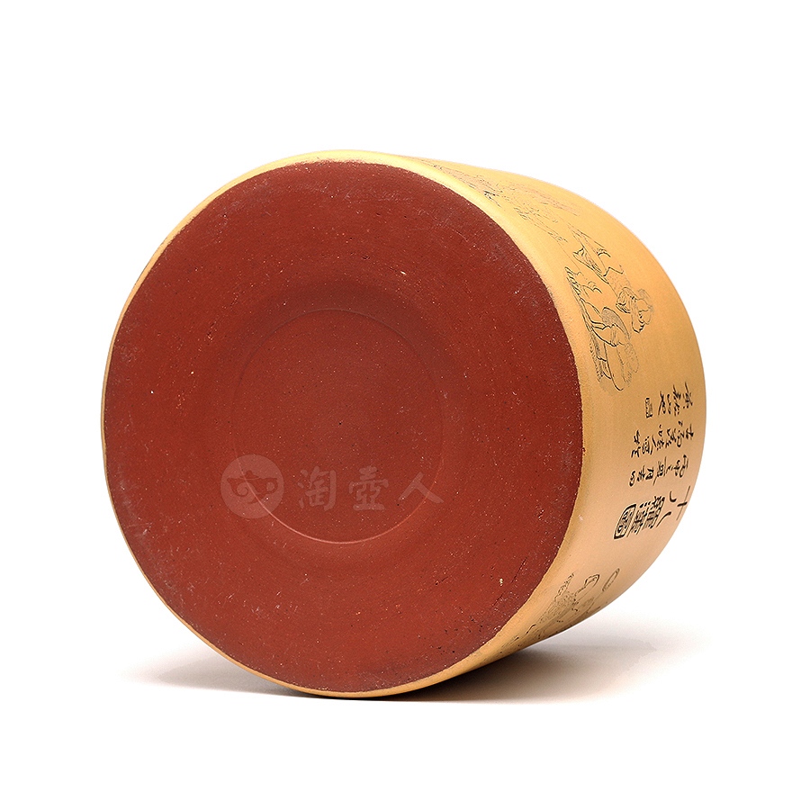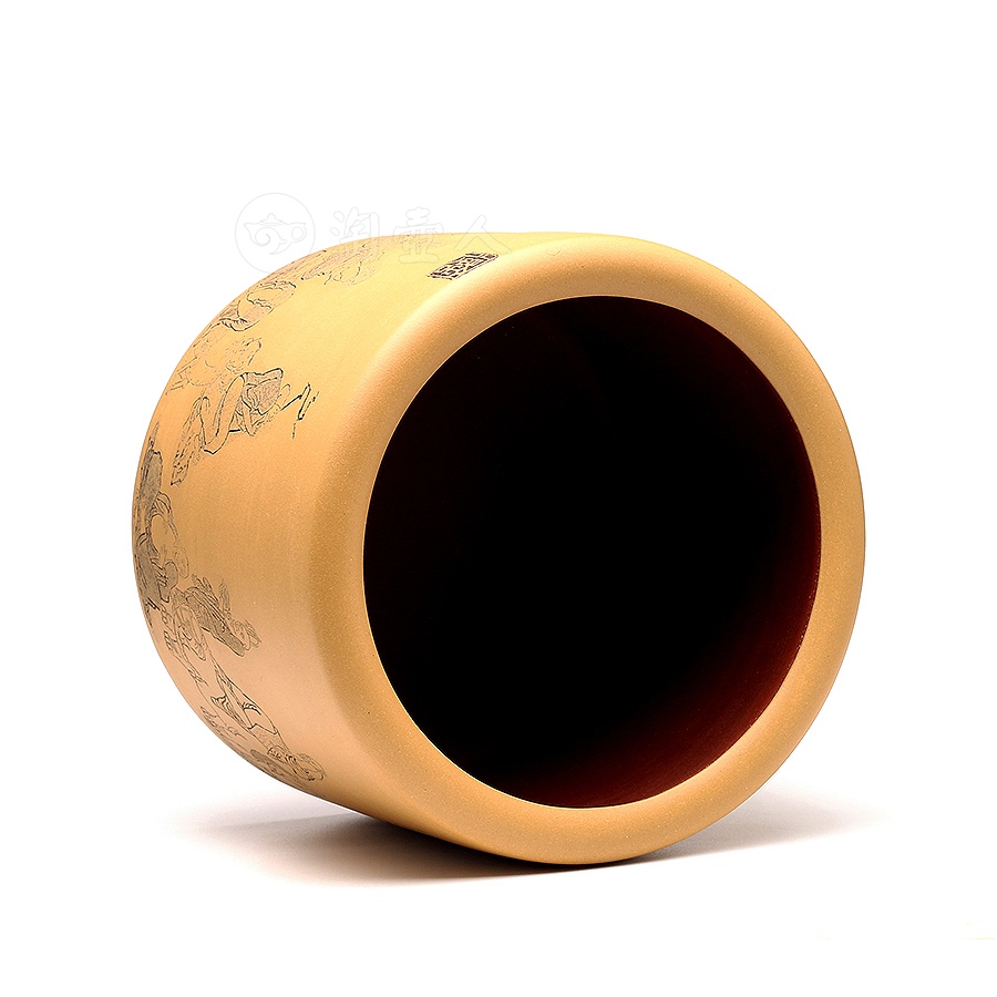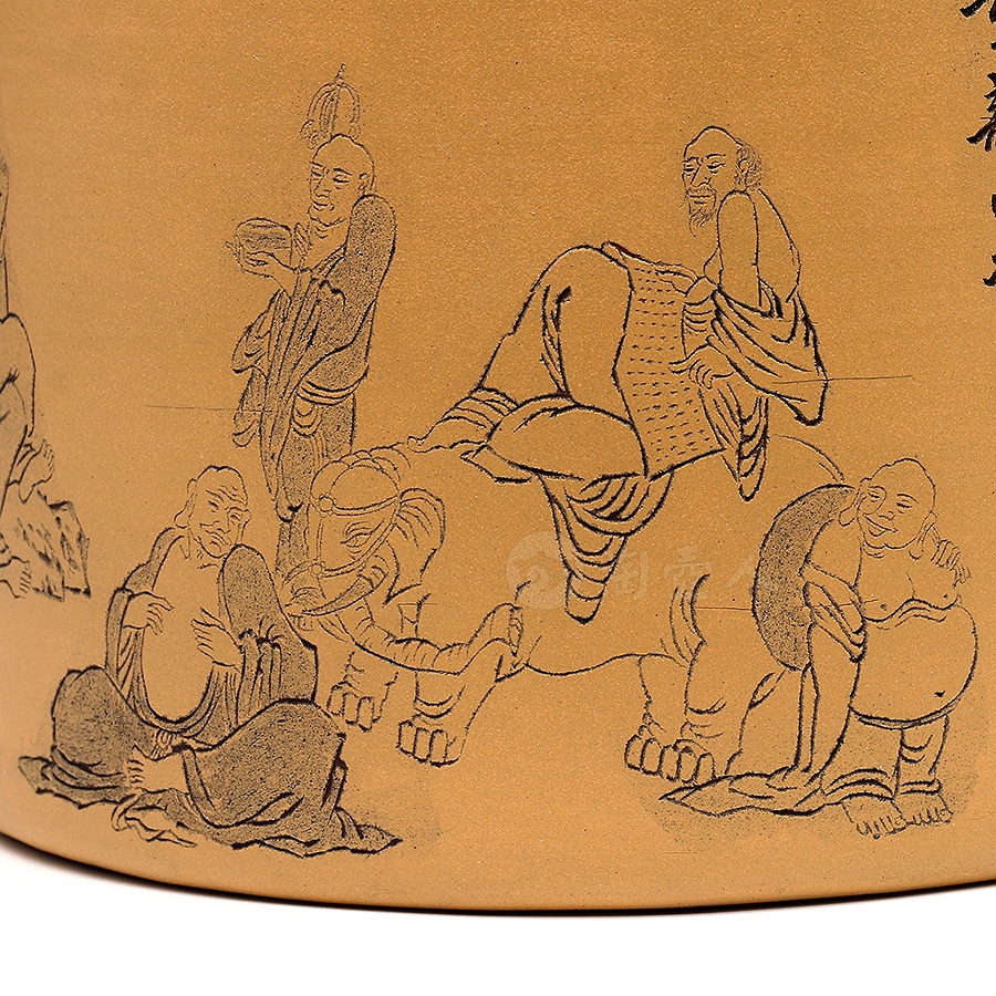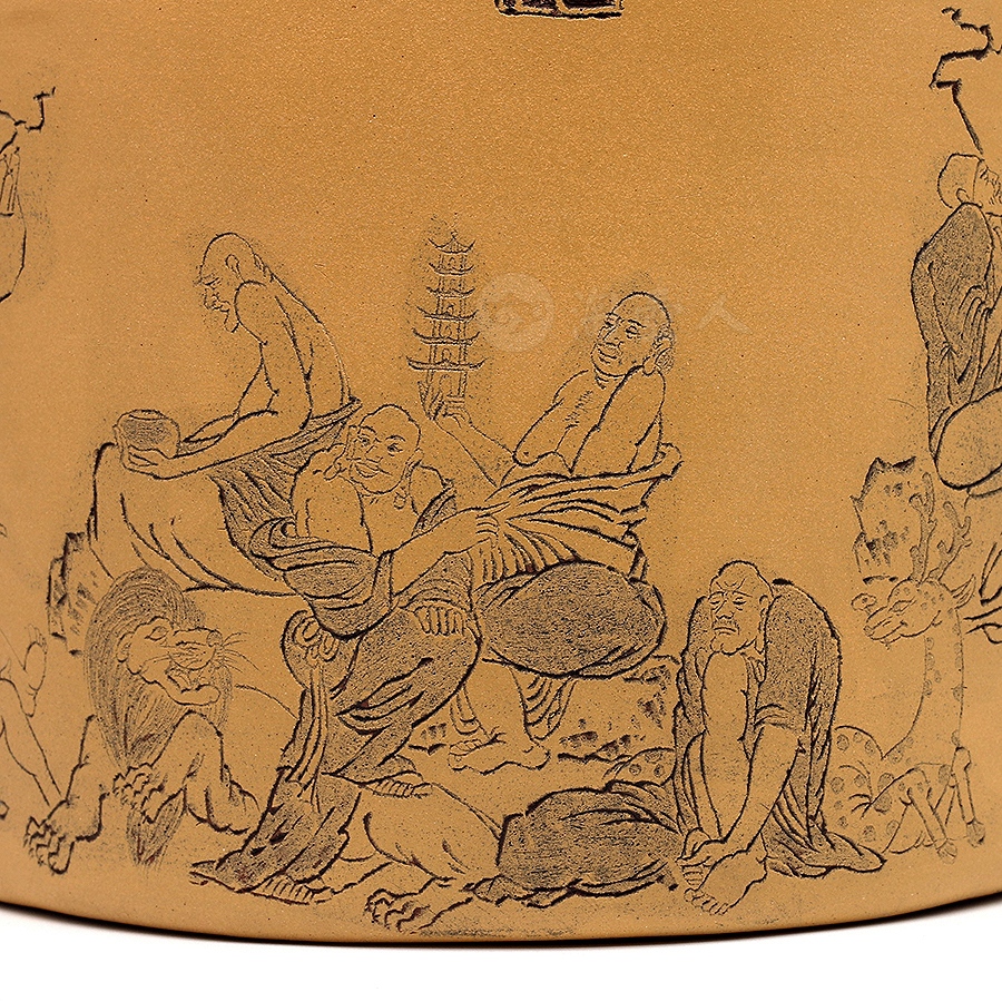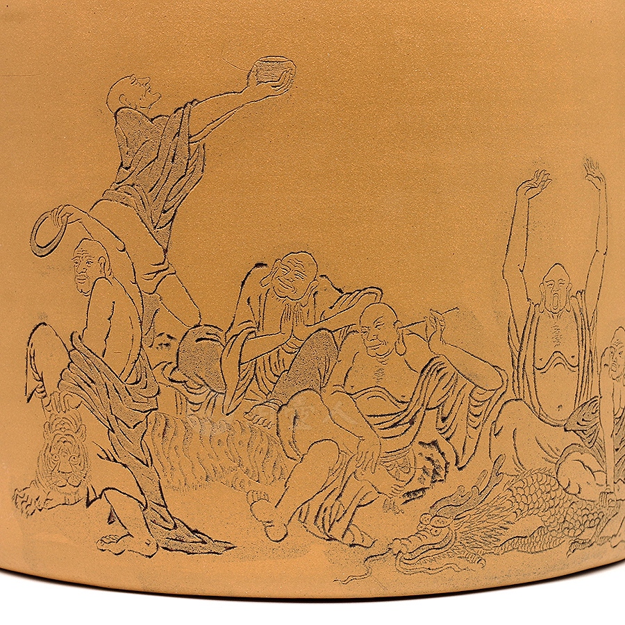 这个笔筒造型简洁,色泽清丽,加上刻绘装饰精致独到,非常增色,圆柱体外观很简练,上下线条笔挺,弧线简洁自然,内红而外黄,色调对比鲜明,更显富丽雅致,刻绘“十八罗汉笔筒 岁在丙申夏月 古阳羡怀人写与黄龙山记 ”,笔筒刻绘十八罗汉图,其线条刻绘清晰分明,品质有感,用于文房再好不过。