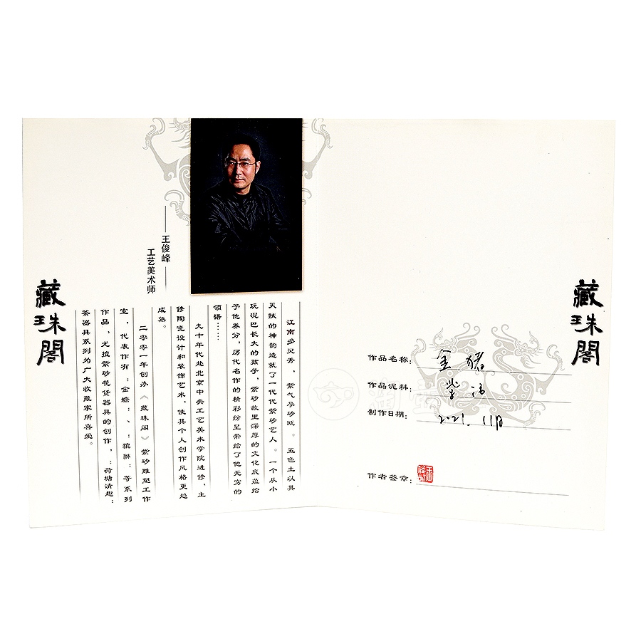 王俊峰,男,生于宜兴丁蜀紫砂世家,实力派陶艺家,1990年毕业于江苏陶瓷专业学校,随后赴北京中央工艺美院进修,主修陶瓷设计和装饰艺术,逐渐形成个人创作风格。2001年创办“藏珠阁”紫砂工作室,其作品以紫砂雕塑、紫砂花器见长,代表作有佛像系列,树桩、梅桩等仿生器系列,技法成熟,功底扎实,意蕴悠远,富有趣味,多件作品入选《中青年杰出陶艺名家》、《茗壶赏析》、《壶史》等书刊,深受海内外藏家喜爱。