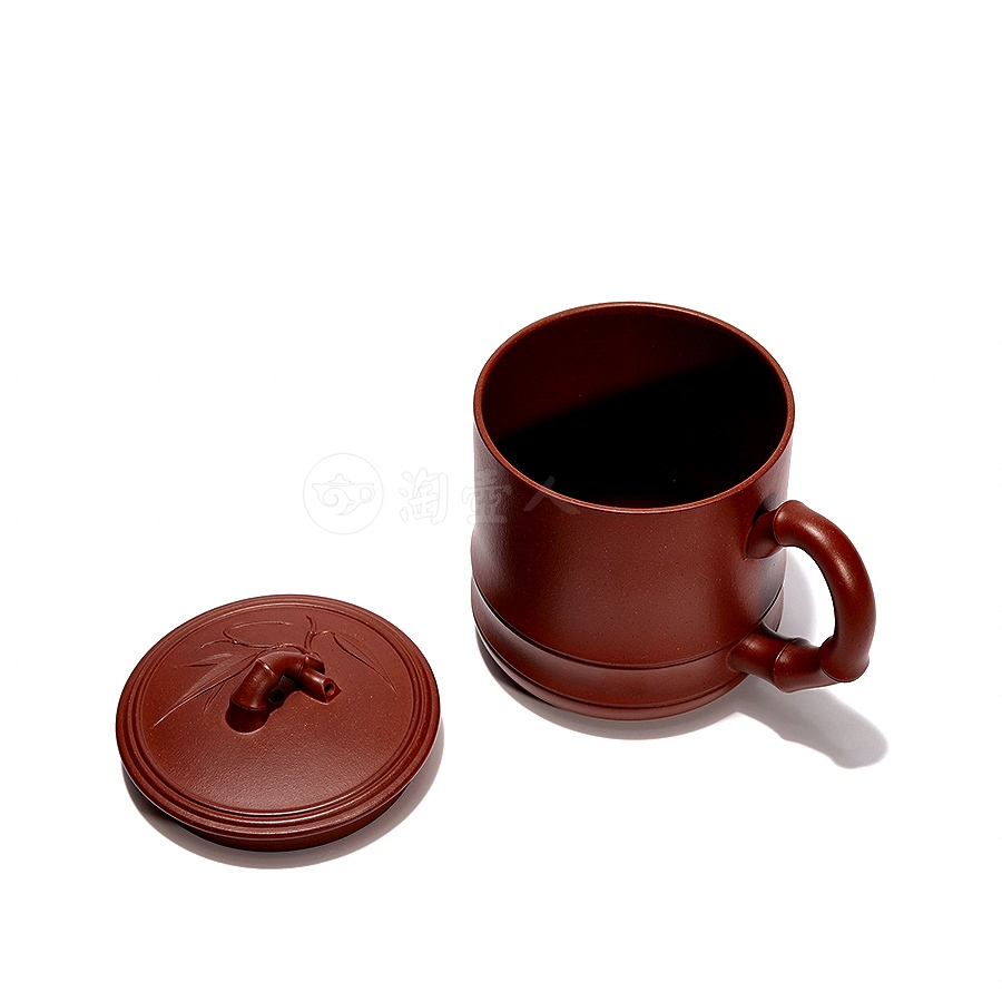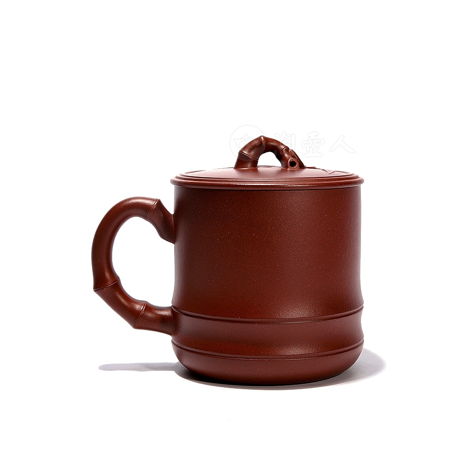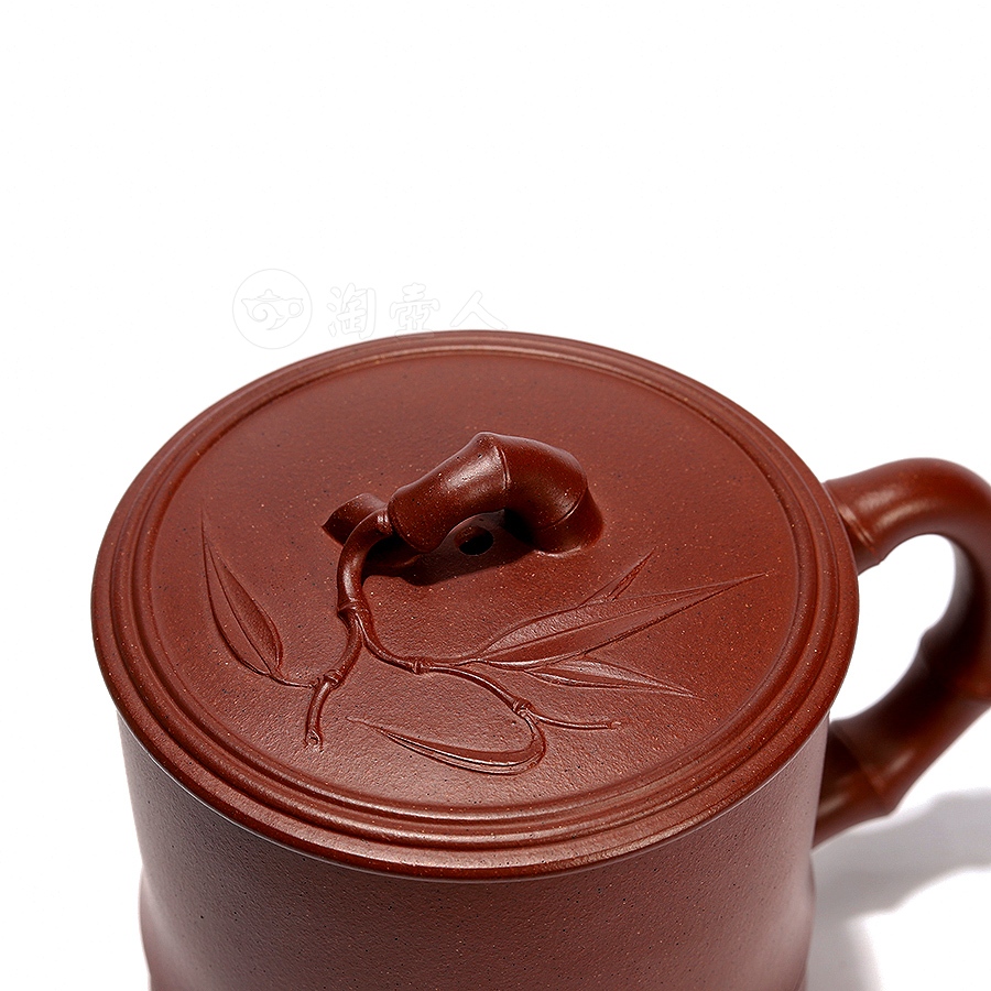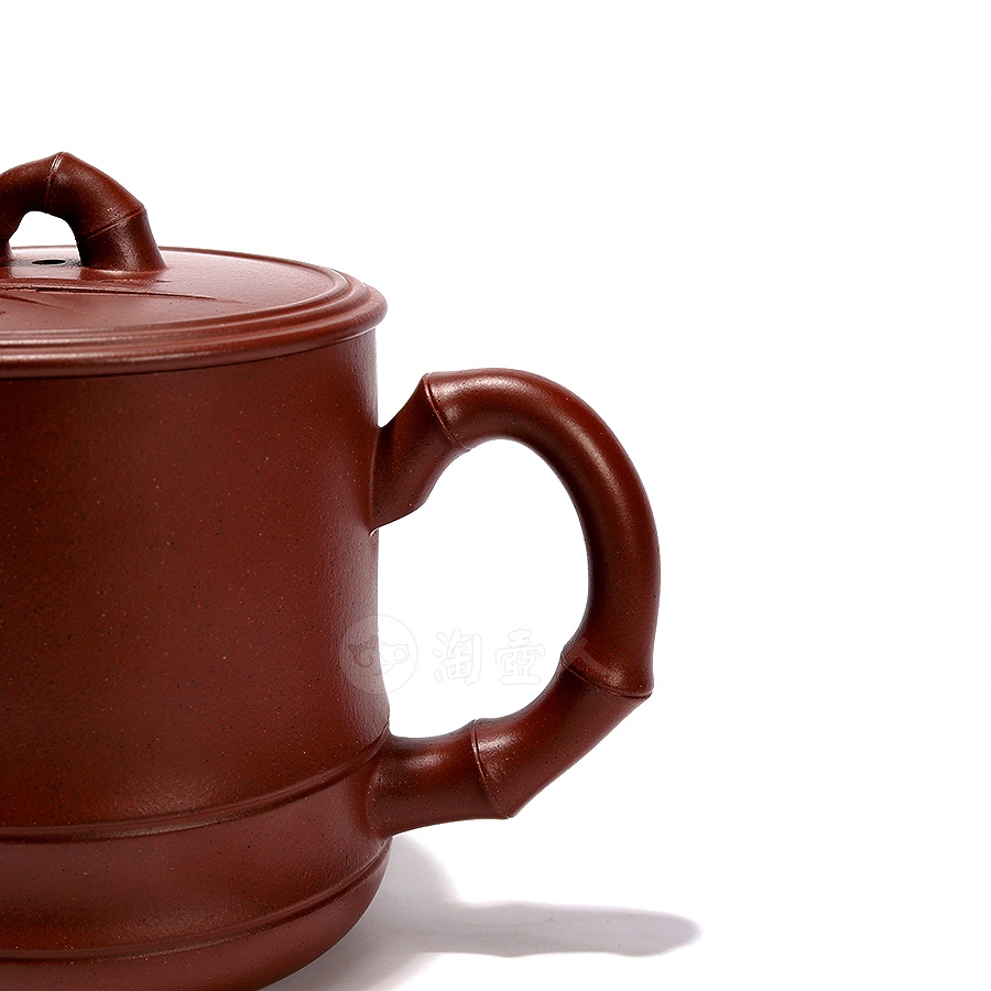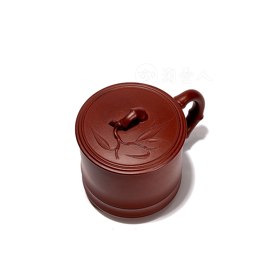 汤先武老师此款紫竹杯选用原矿底槽清制成,整器取材于竹,壶体呈一段竹节造型,蜷竹段为钮,微微隆起,苍劲有力,寓意节节高升,壶钮延伸出一截竹枝至盖面,竹叶清秀俊逸,自然舒展,富有生机。圆把亦以竹节塑之,持握稳定,便于拿放。