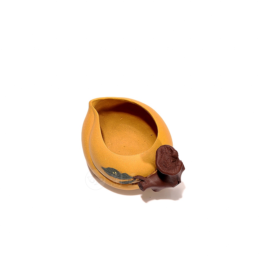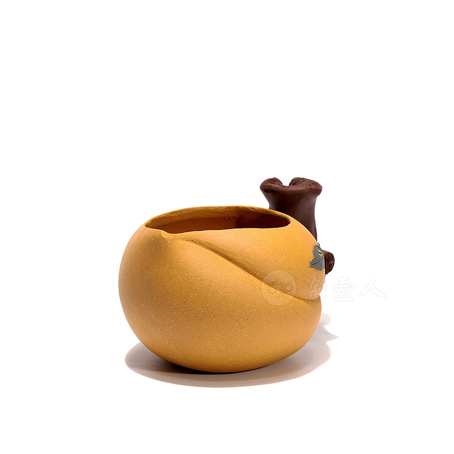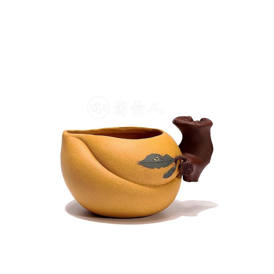 《寿桃公道杯》以原矿段泥作胎,造型取自然之象,杯身圆硕饱满,宛若一颗成熟的黄金寿桃,杯柄化为陶木树干,古朴苍劲,与杯腹相连,浑然天成。杯壁又加以青翠树叶进行点缀,更显生机与活力。整器栩栩如生,精巧可爱,适宜日常把玩使用。