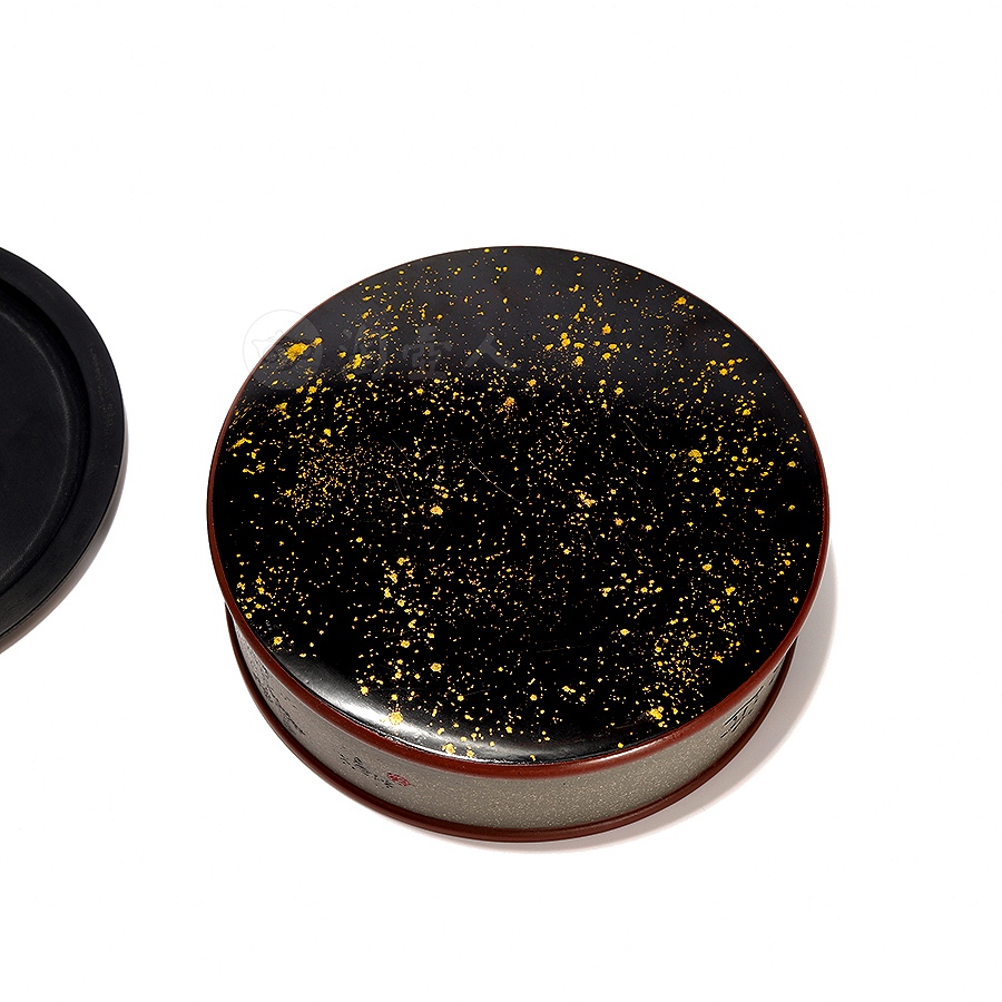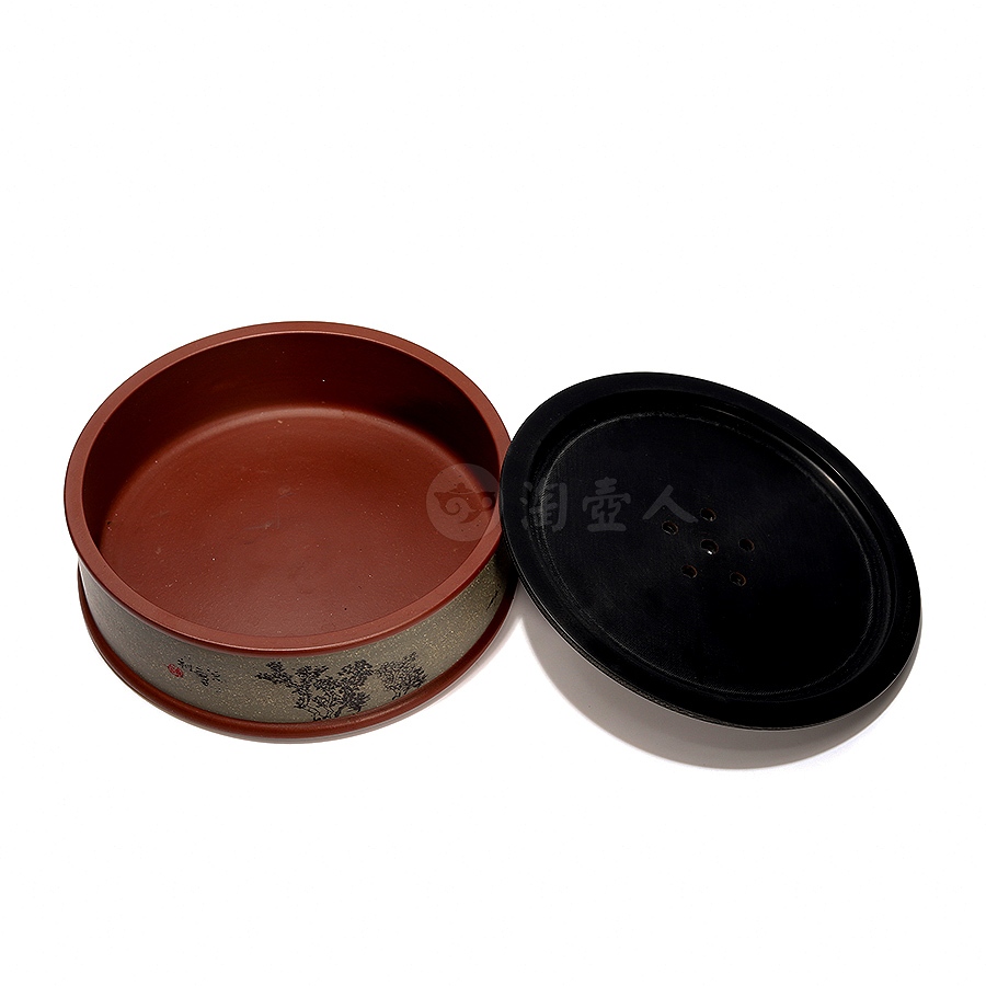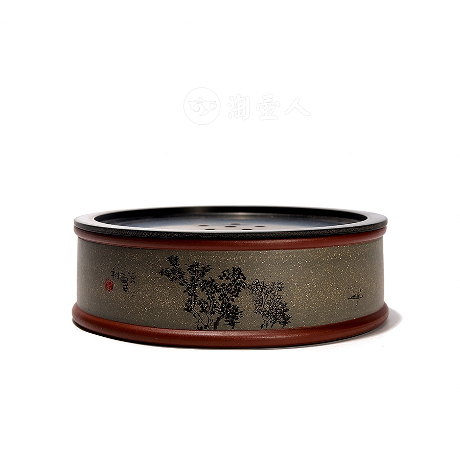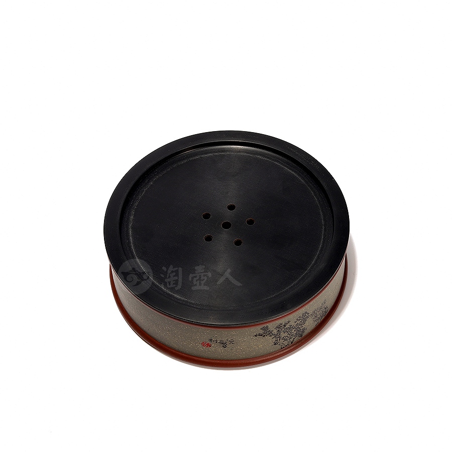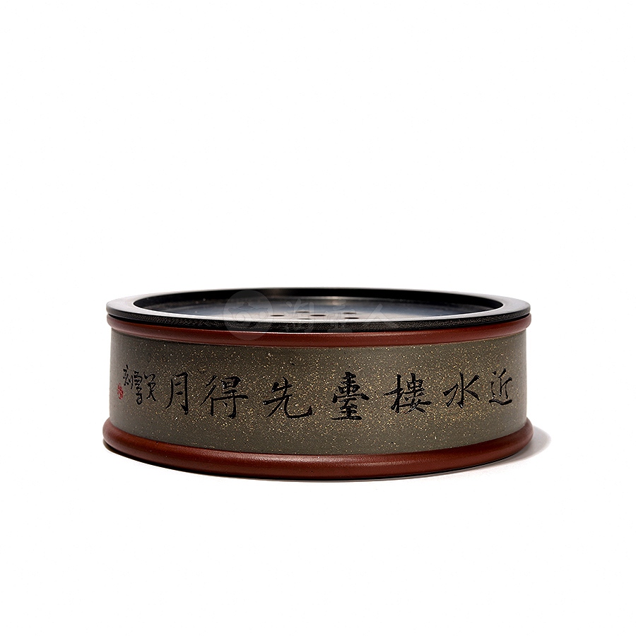 此件圆形壶承为作者采用原矿紫泥精工而制,盖为铝制,底面涂以大漆,侧面精刻山水风貌,配以诗句“近水楼台先得月”,极富诗情画意,清幽高雅,茶韵飘香。