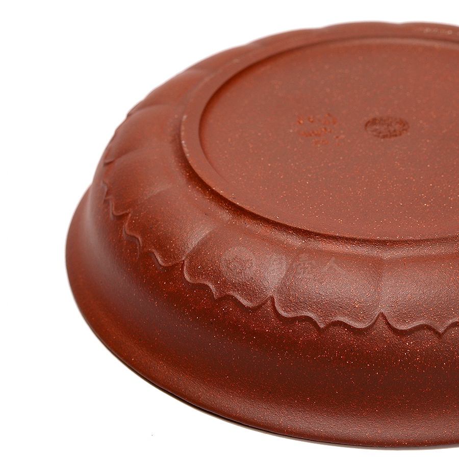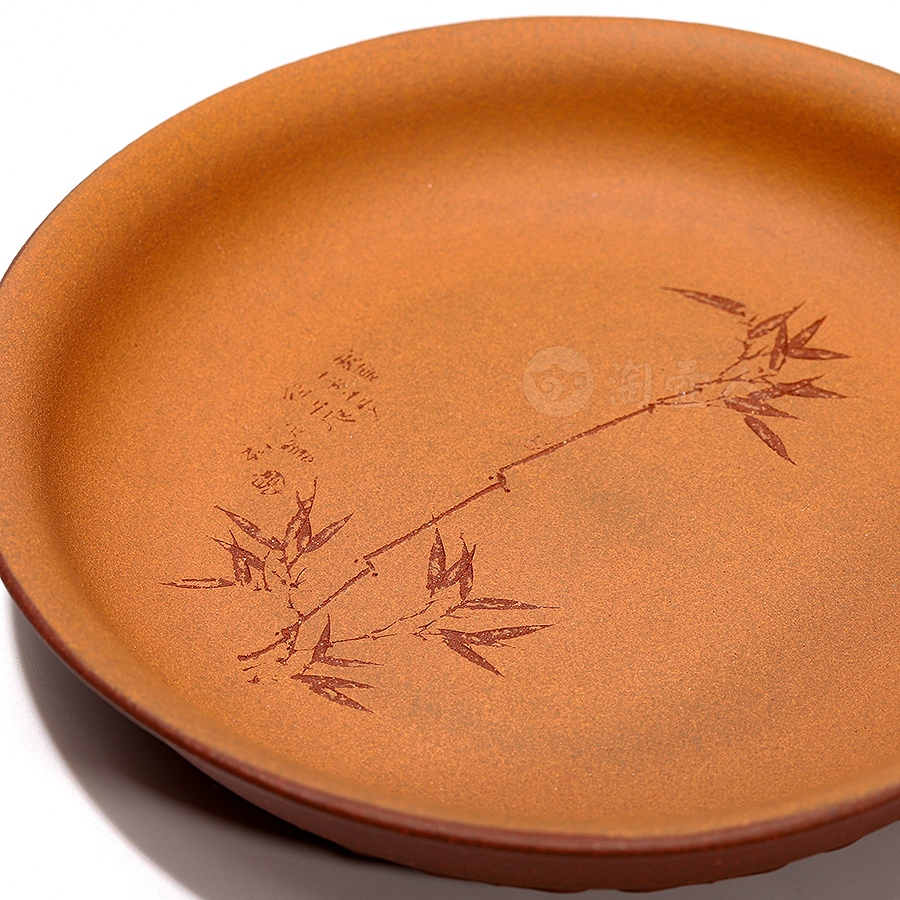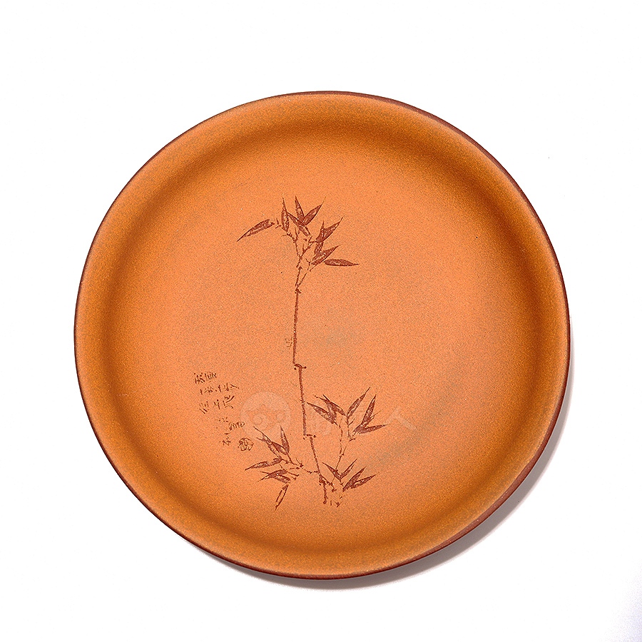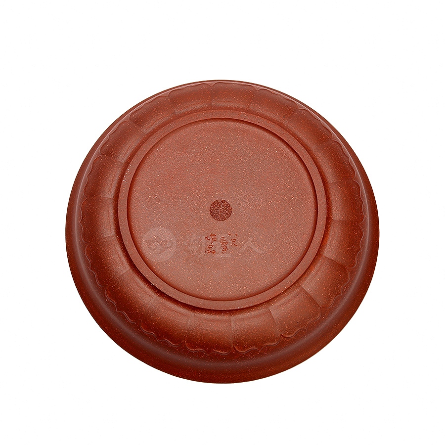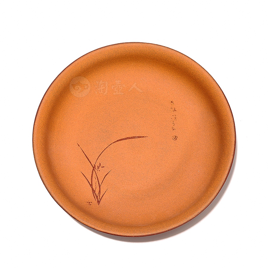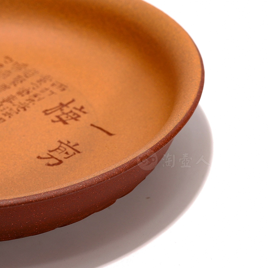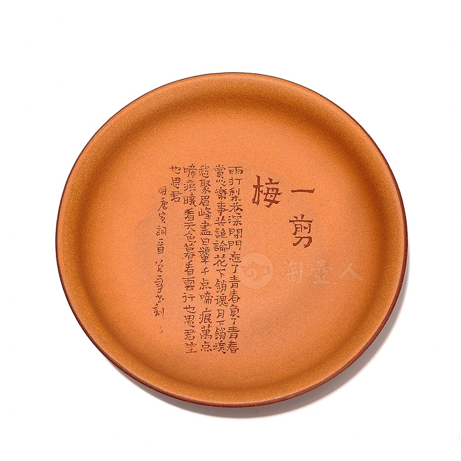 此款壶承以原矿底槽清作胎,伴以粒粒金砂,古朴典雅,透气性佳。圆形壶身造型简洁,内刻明代唐寅《一剪梅·雨打梨花深闭门》诗句,意蕴悠长,耐人寻味。