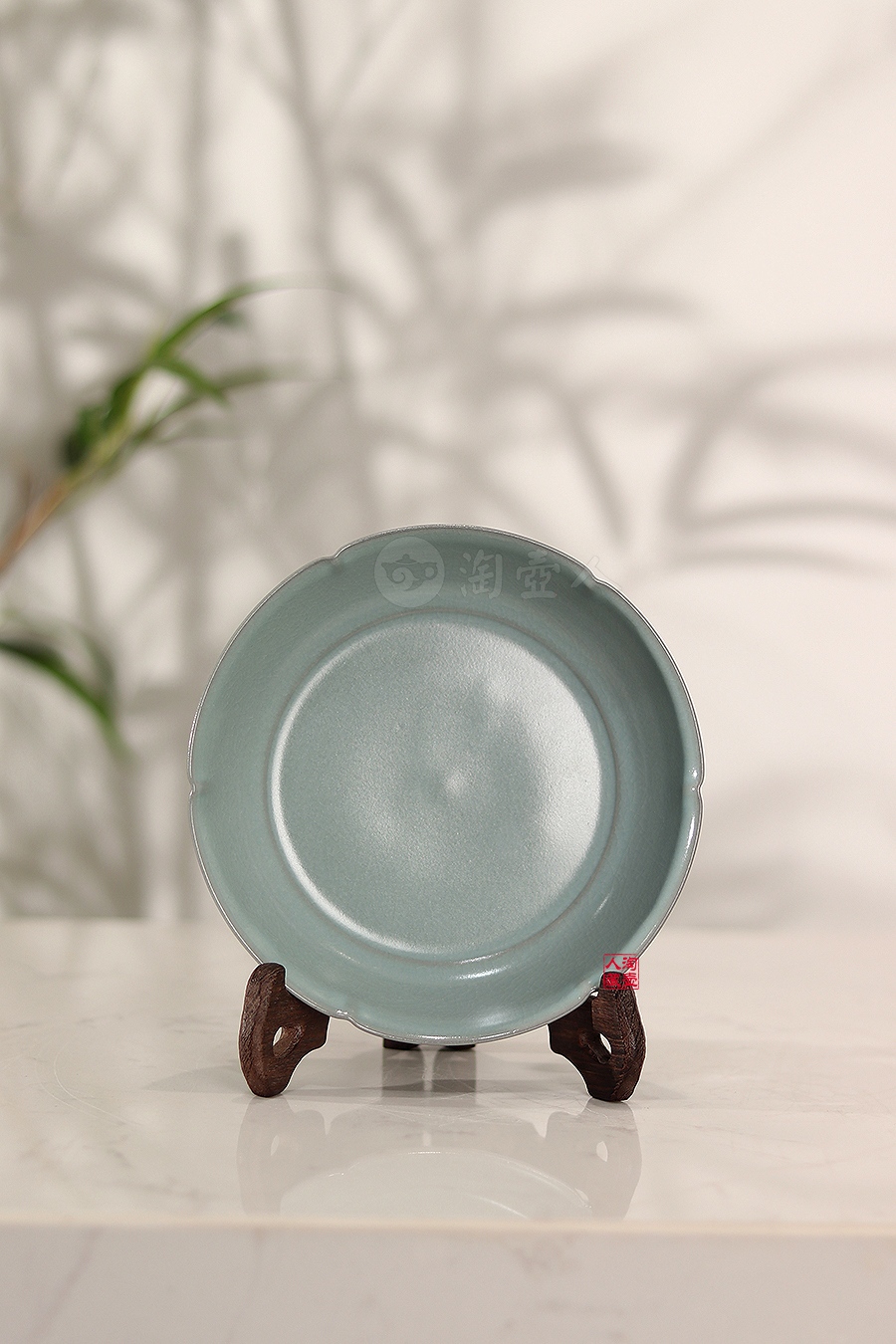 此件葵口盘,香灰胎,釉水甄选仿古天青釉,色泽古朴雅致,自带汝瓷的温润气韵。器型设计精巧别致,广口浅腹,口沿处精心雕琢六处规整凹进,外壁对应勾勒内凹线条,整体造型宛若一朵盛放的葵花。