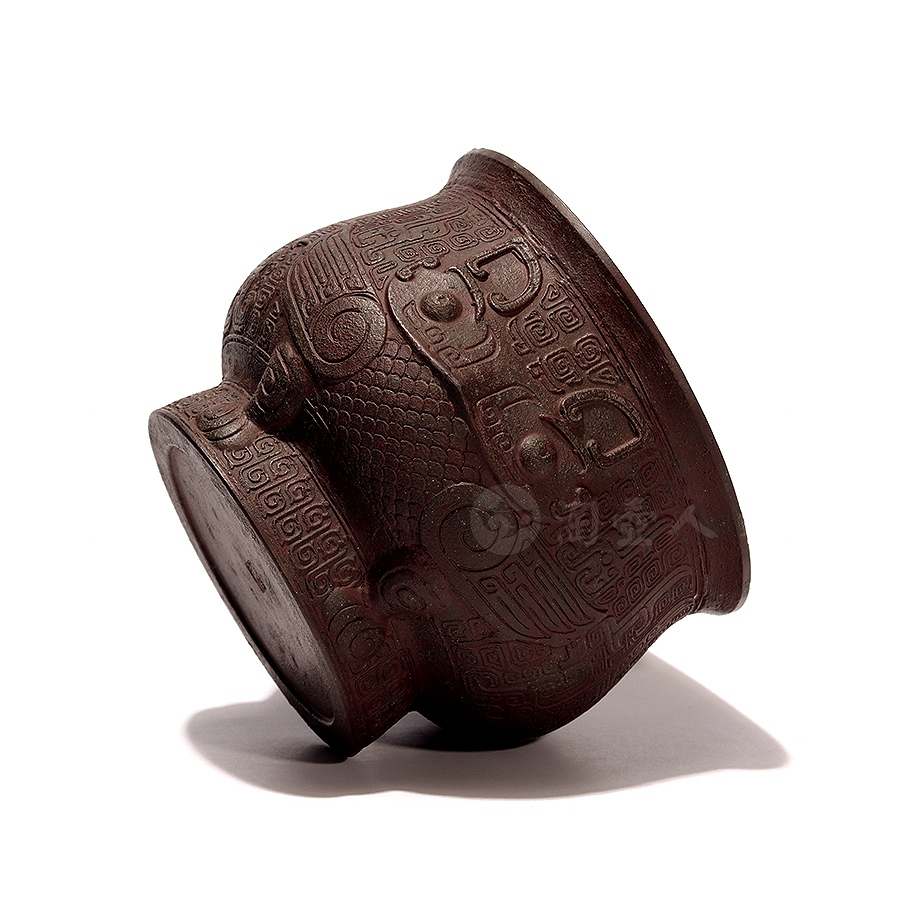 此件水盂选用原矿紫泥制作而成,圆口撇沿,垂腹,高圈足,器型肃穆稳重,古意卓然,有大气磅礴之感。器表内外皆仿青铜器质感,乃是采紫泥与绿泥双色泥料,以高难度粉浆工艺纯手工修饰而成,锈蚀之感犹如天成,愈泡养愈显。