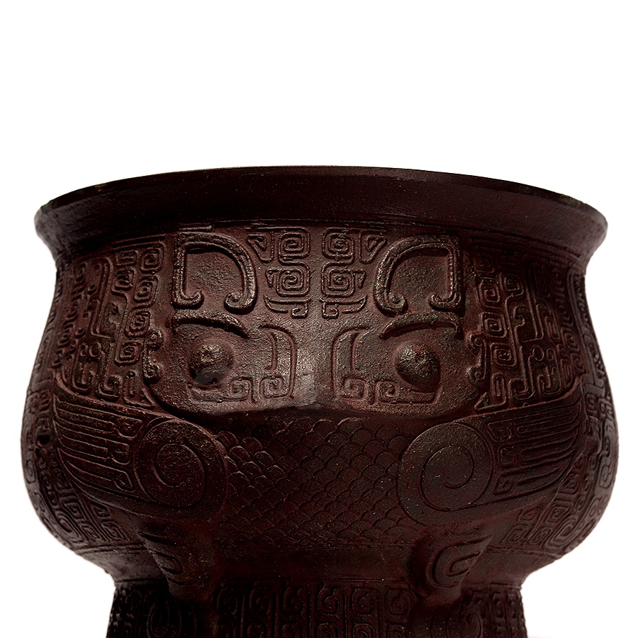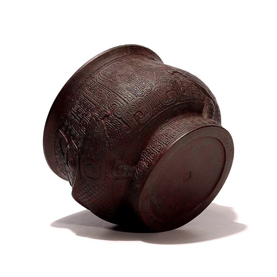 外壁以云雷纹填底,两侧对称装饰鸮纹,刻画细腻,层次丰富,浑厚神秘、庄重大气中流露出些许俏皮可爱的气息。整器沿袭古青铜器遗风,设计精巧,制作精良,属难得一见的文房佳作。