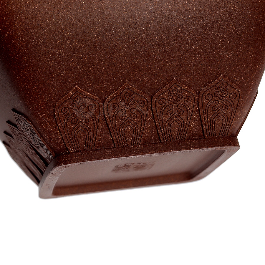 罐身采用印版贴花工艺装饰,图案压印精致清晰,毫厘分明,罐口处饰回纹花卉与蝉纹,回纹连绵不绝,蝉纹生动鲜活,寓意吉祥;近底处则缀梵莲纹,花瓣舒展清雅,尽显禅意。整器上手轻便不压手,风格古朴雅致,将清代紫砂器的端庄气韵展现得淋漓尽致。紫砂罐透气但不透水,既锁住茶香、留存茶色,避免茶叶走味变色,又可有效隔绝潮气,保持罐内干燥,可谓美感与实用性并存。
