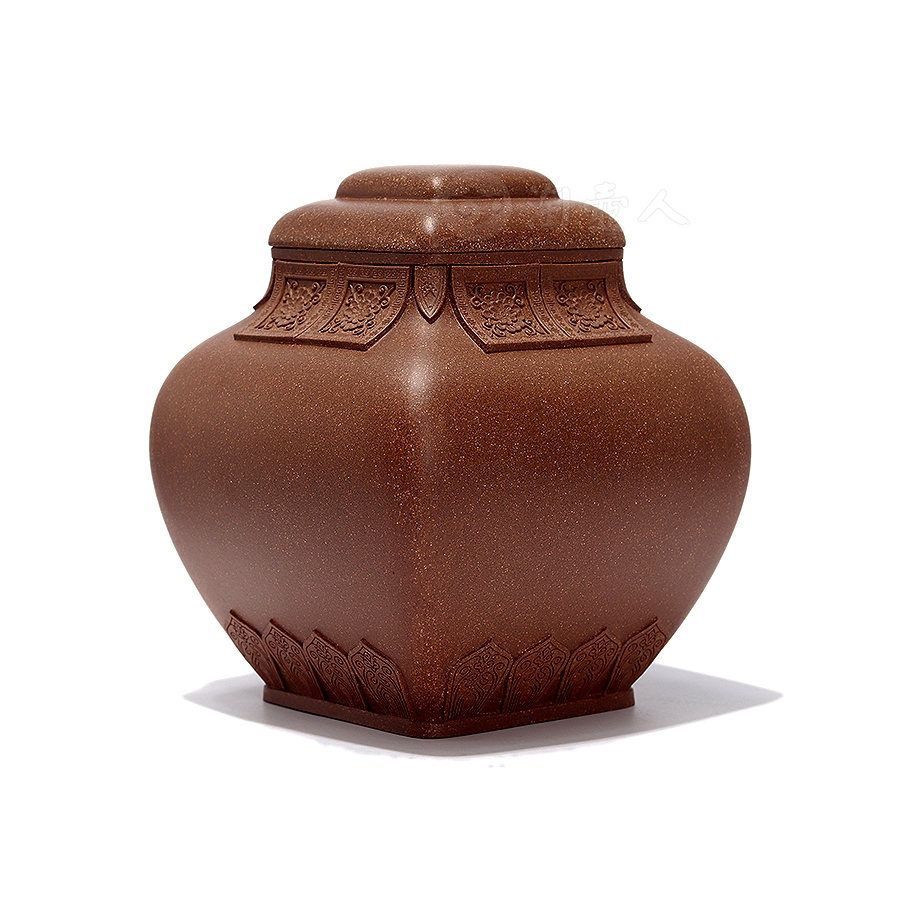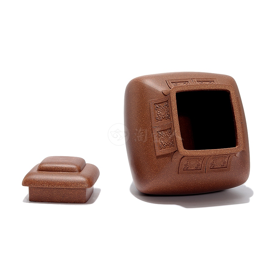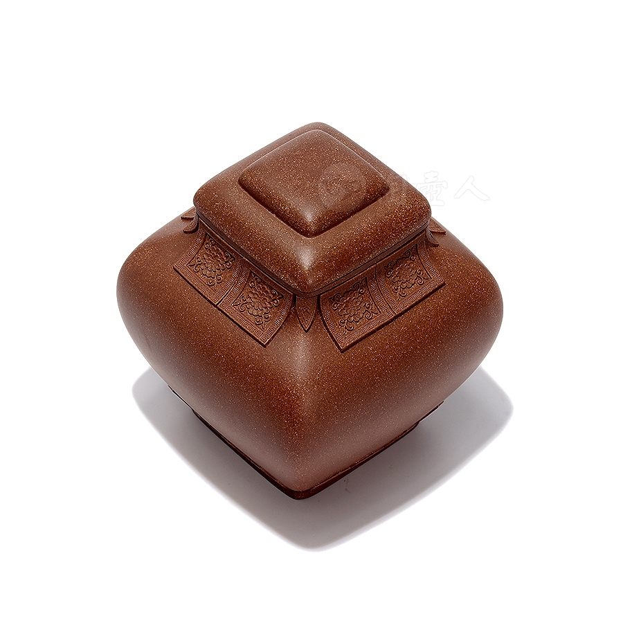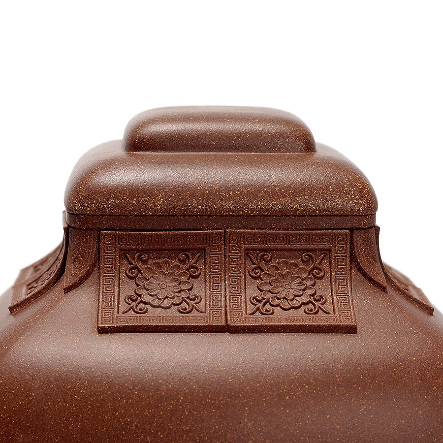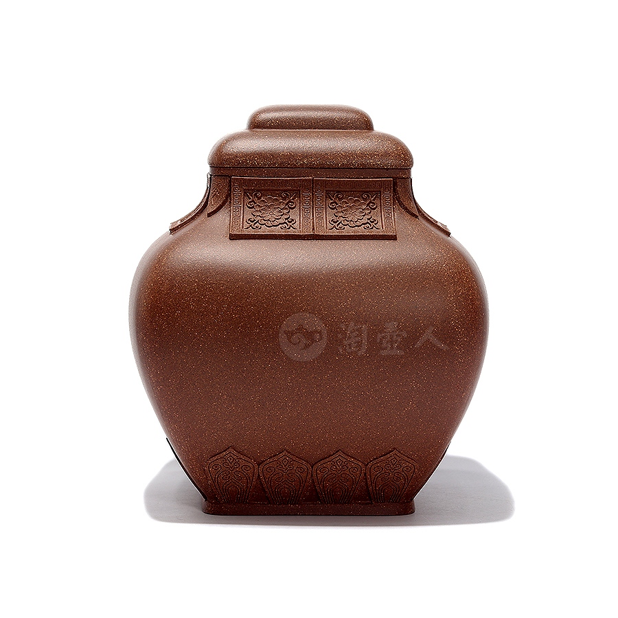 此件茶叶罐,选用原矿段泥为胎,一比一复刻清乾隆时期经典罐器,罐身呈四方造型,乃全手工四片拼接成型,每一处接缝皆隐于肌理,不见匠痕,鼓肩,敛腹,圈足底,线条变化有致,四角皆以柔和圆弧过渡,于方正规矩中融入圆融之美。罐盖一改常规木制,同取紫砂材质打造,质地轻盈灵巧,且能与罐身精准咬合,更显难度。