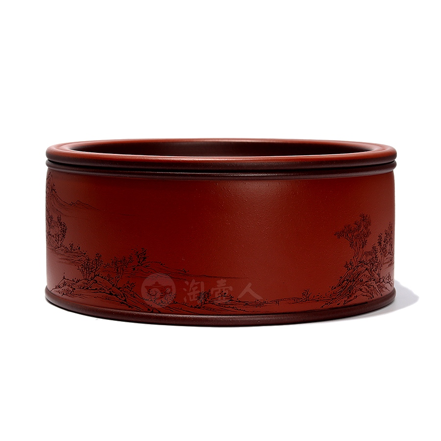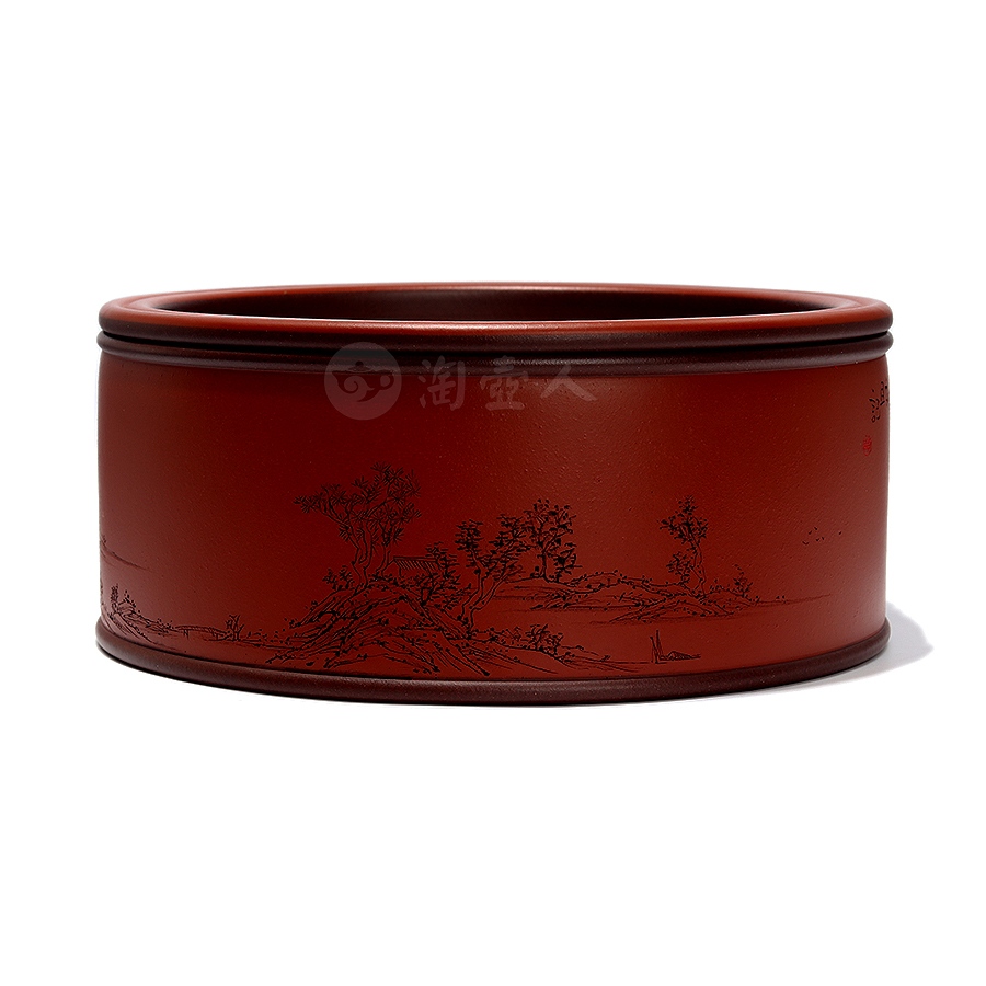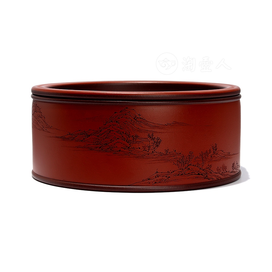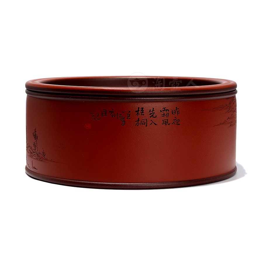 茶仓,又称茶罐、茶盒,用于储存茶叶,具有防潮、防异味、隔热功能,可维持茶叶品质。此件天合茶仓,分体设计,罐身、罐盖两部分完满相契,工艺严谨,密封性佳。外壁环刻山水图景,远山巍峨,碧水浩渺,其间林木葱茏、茅舍错落,一架小桥横卧溪上,细节勾勒入微,留白处题刻“昨夜霜风先入梧桐”,落款“八尺一寻刻且记”。