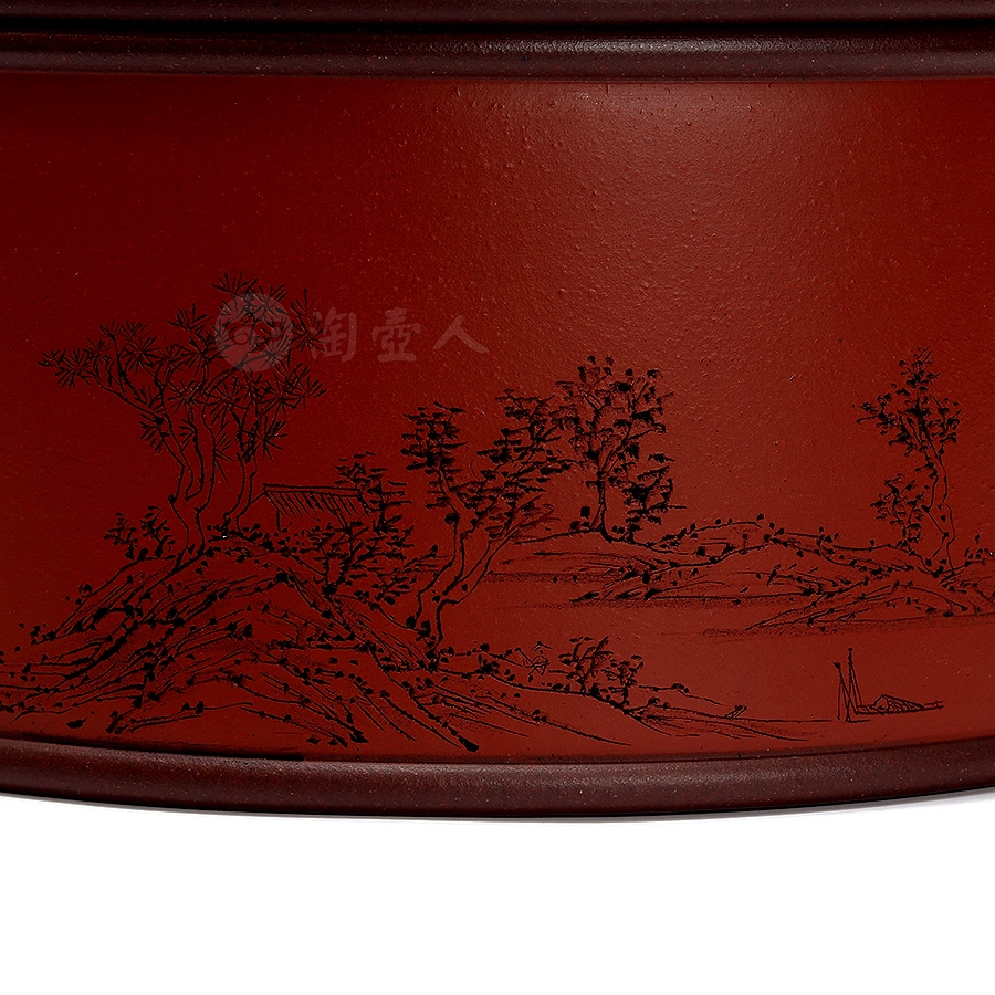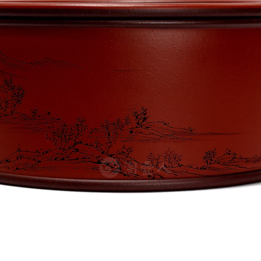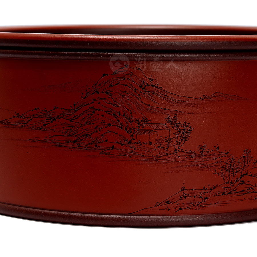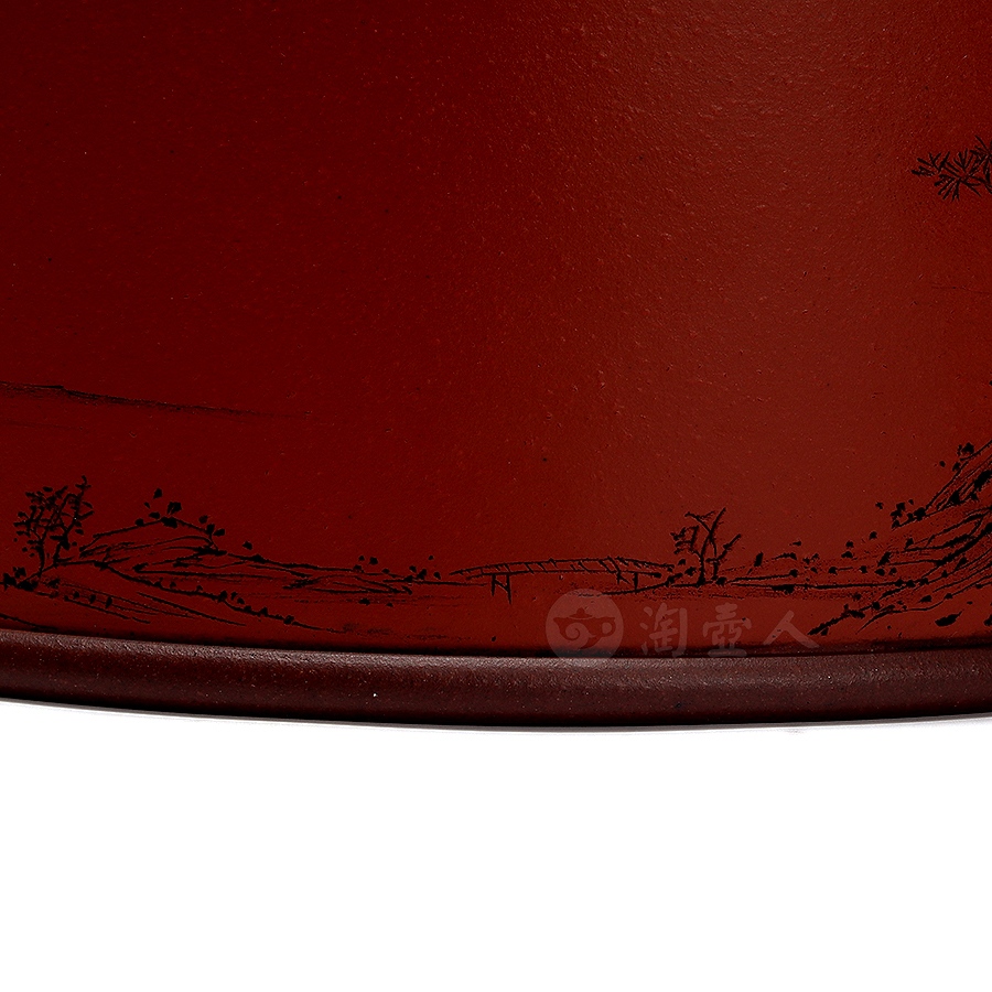 茶仓,又称茶罐、茶盒,用于储存茶叶,具有防潮、防异味、隔热功能,可维持茶叶品质。此件天合茶仓,分体设计,罐身、罐盖两部分完满相契,工艺严谨,密封性佳。外壁环刻山水图景,远山巍峨,碧水浩渺,其间林木葱茏、茅舍错落,一架小桥横卧溪上,细节勾勒入微,留白处题刻“昨夜霜风先入梧桐”,落款“八尺一寻刻且记”。