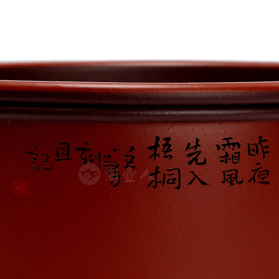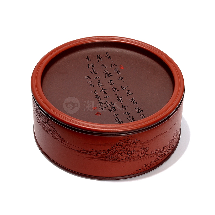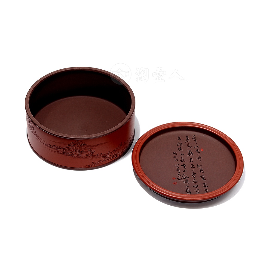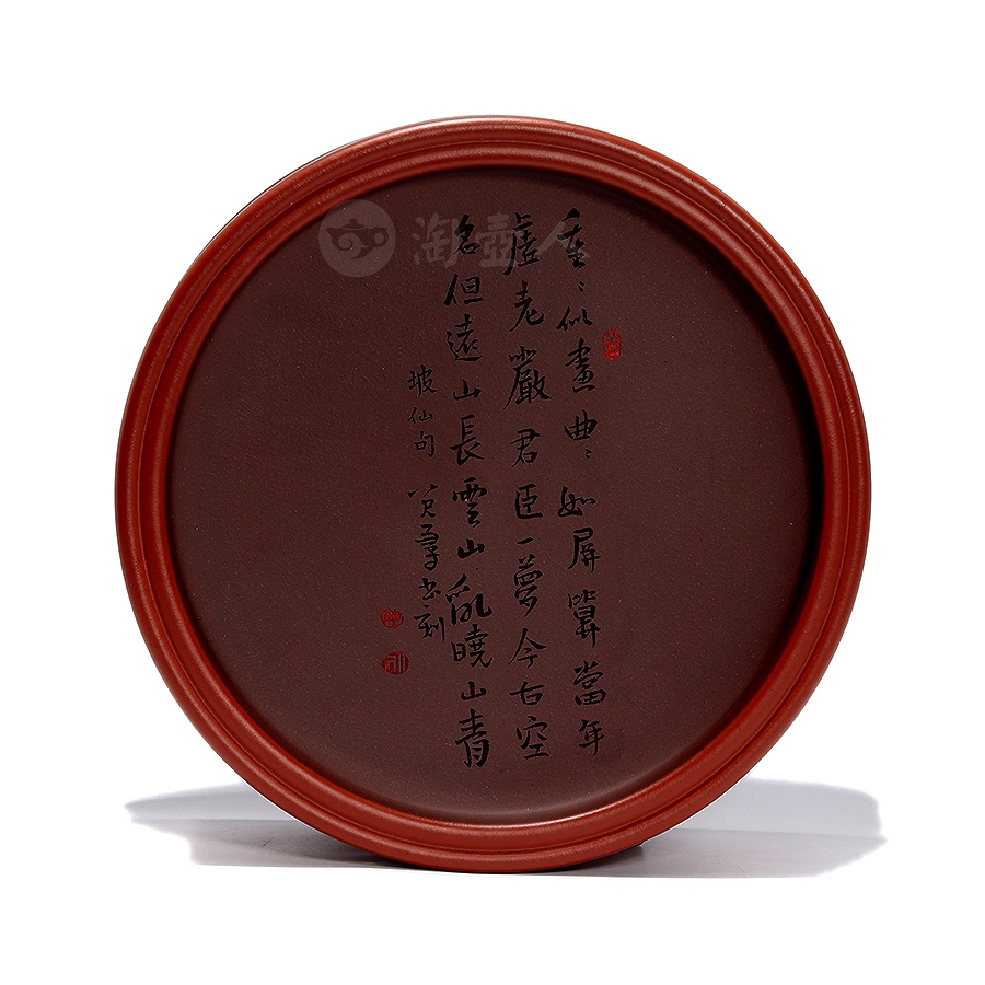 盖面则刻诗句“重重似画,曲曲如屏。算当年、虚老严陵。君臣一梦,今古空名。但远山长,云山乱,晓山青”[宋 苏轼《行香子·过七里濑》],落款“坡仙句,八尺一寻书刻”。此器兼具储茶之用与文人雅玩之趣,执手摩挲间,茶香未启,已见诗情画意。