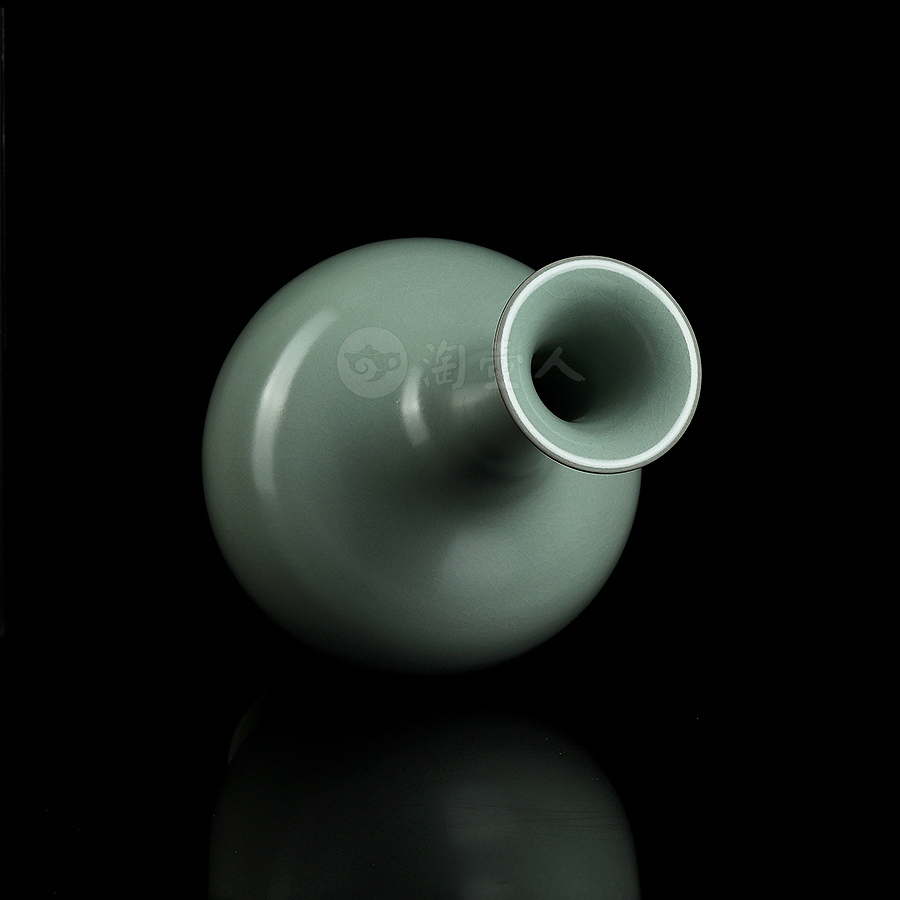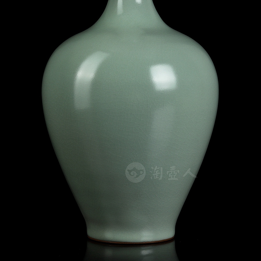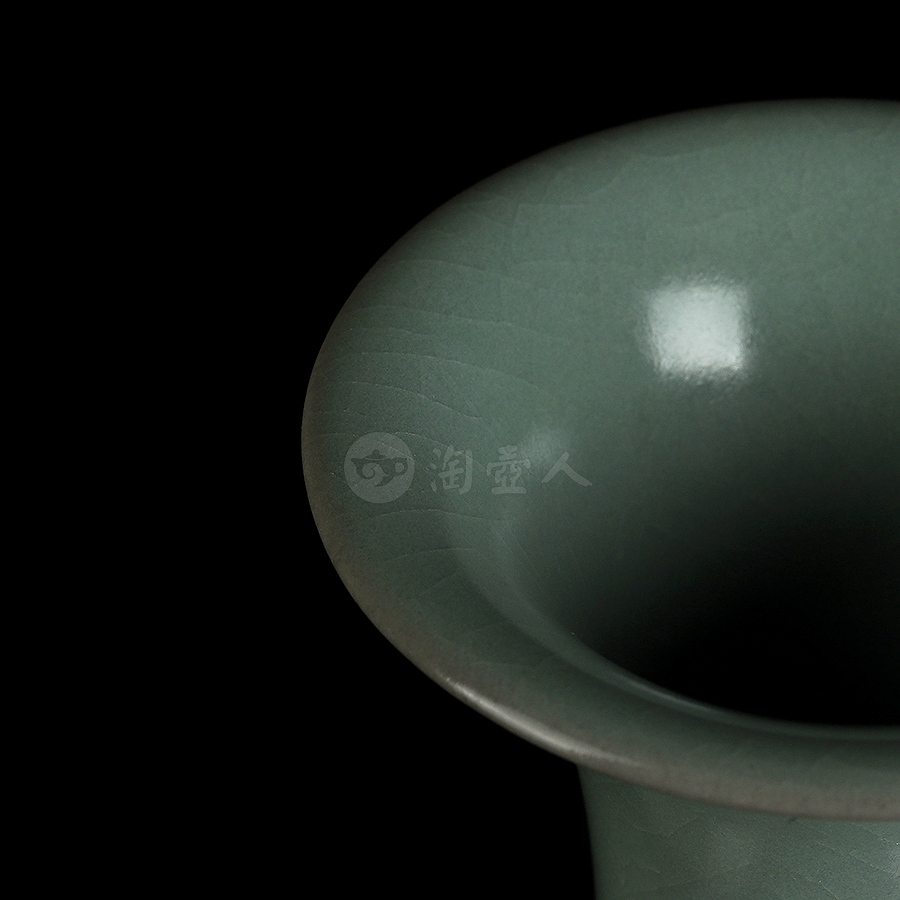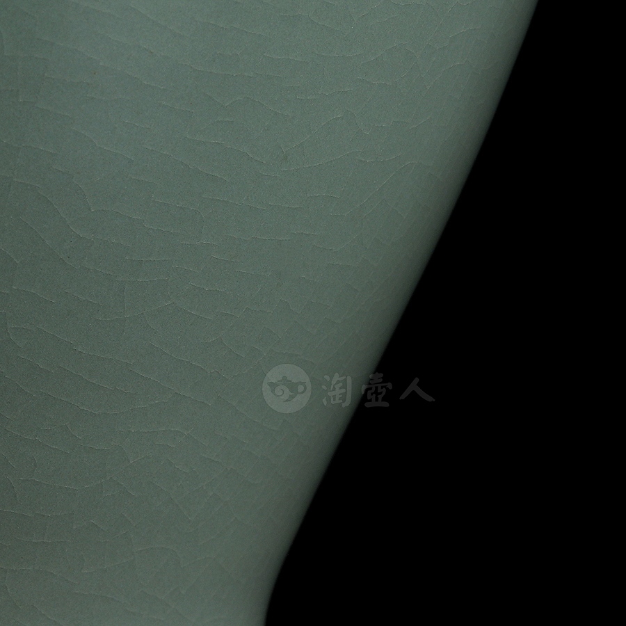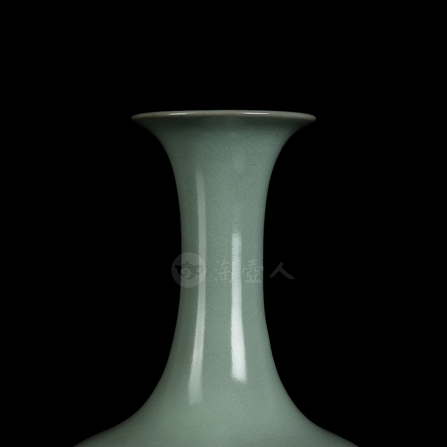 通体施仿古粉青釉,釉如凝脂,极其匀净,呈色柔和,清纯宁静,青中闪蓝,如同雨过天青,冰裂莹澈,瓶身布满细密开片,细腻自然,巧若天工。整瓶器形巧致而素雅,釉色宁静淡然,充分体现出汝瓷之美。