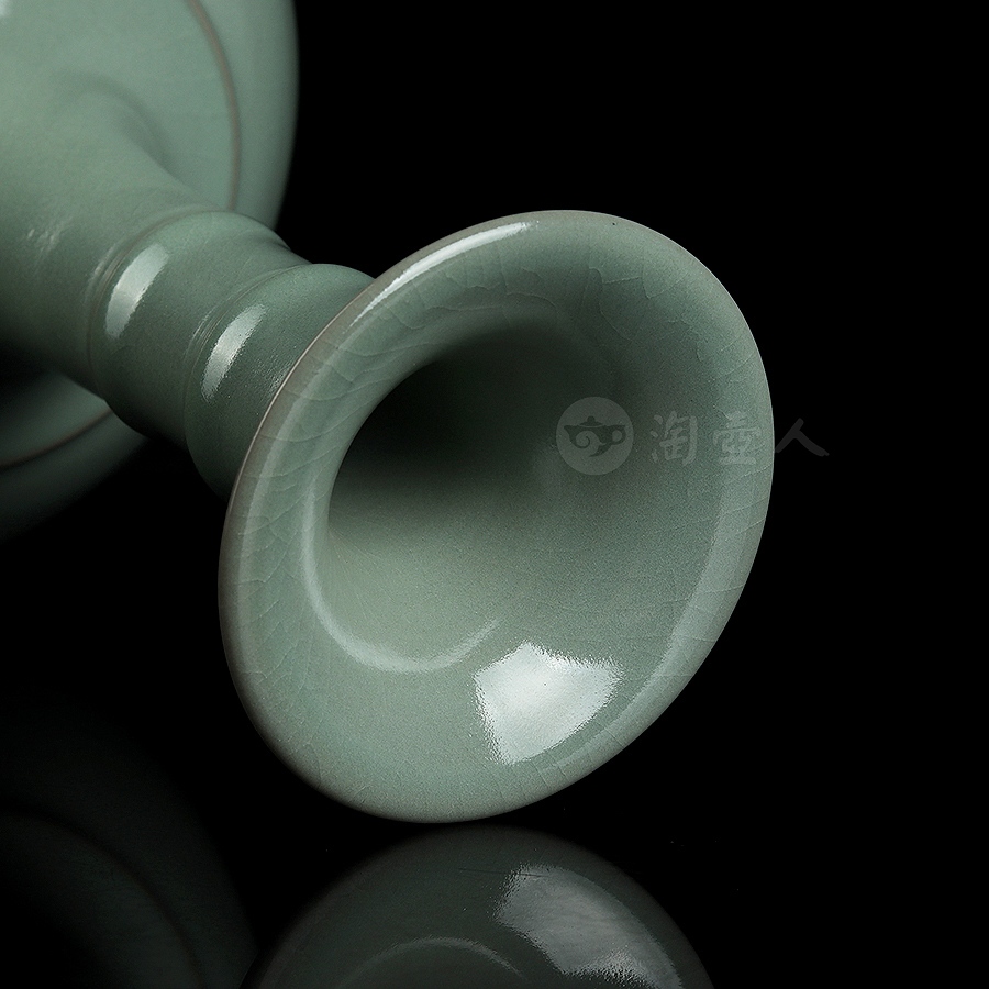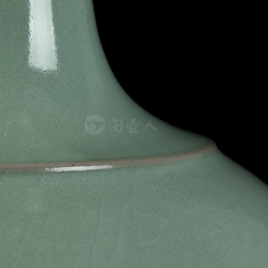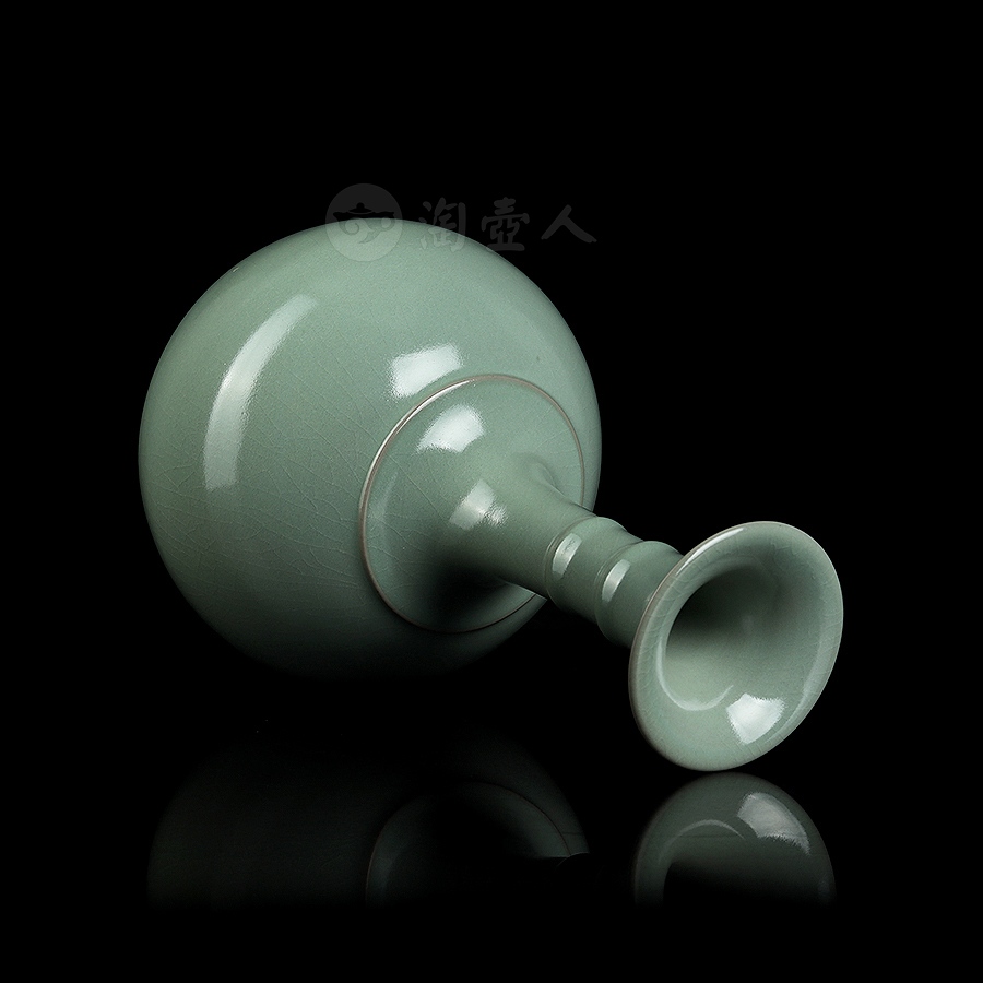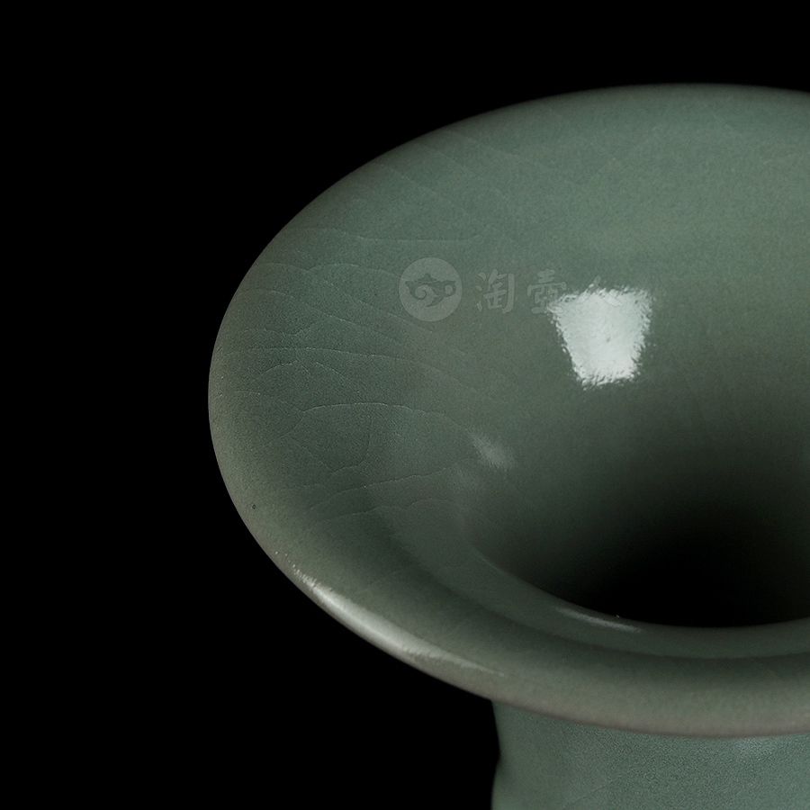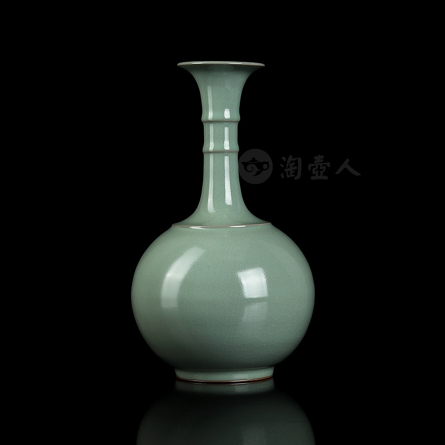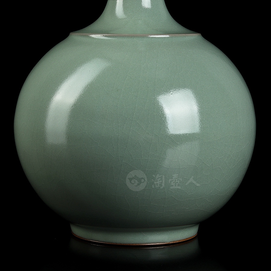 通体施仿古釉,釉如凝脂,极其匀净,呈色柔和,清纯宁静,青中闪蓝,如同雨过天青,冰裂莹澈,瓶身布满细密开片,细腻自然,巧若天工。整瓶器形巧致而素雅,釉色宁静淡然,充分体现出汝瓷之美。