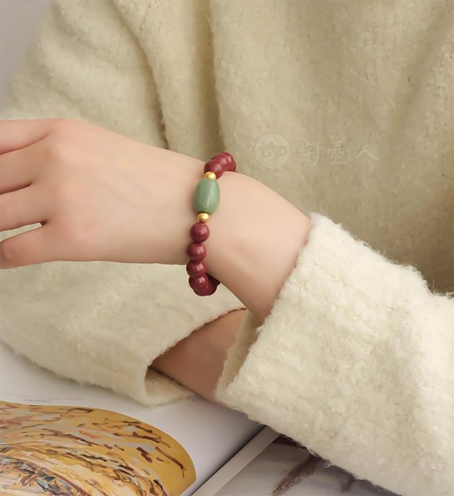 此手串灵感源自敦煌壁图《九色鹿》,以一颗18mm豆绿汝瓷珠、两颗6mm925银镀金以及数颗10mm朱砂串成,寓意“诸事顺遂”。