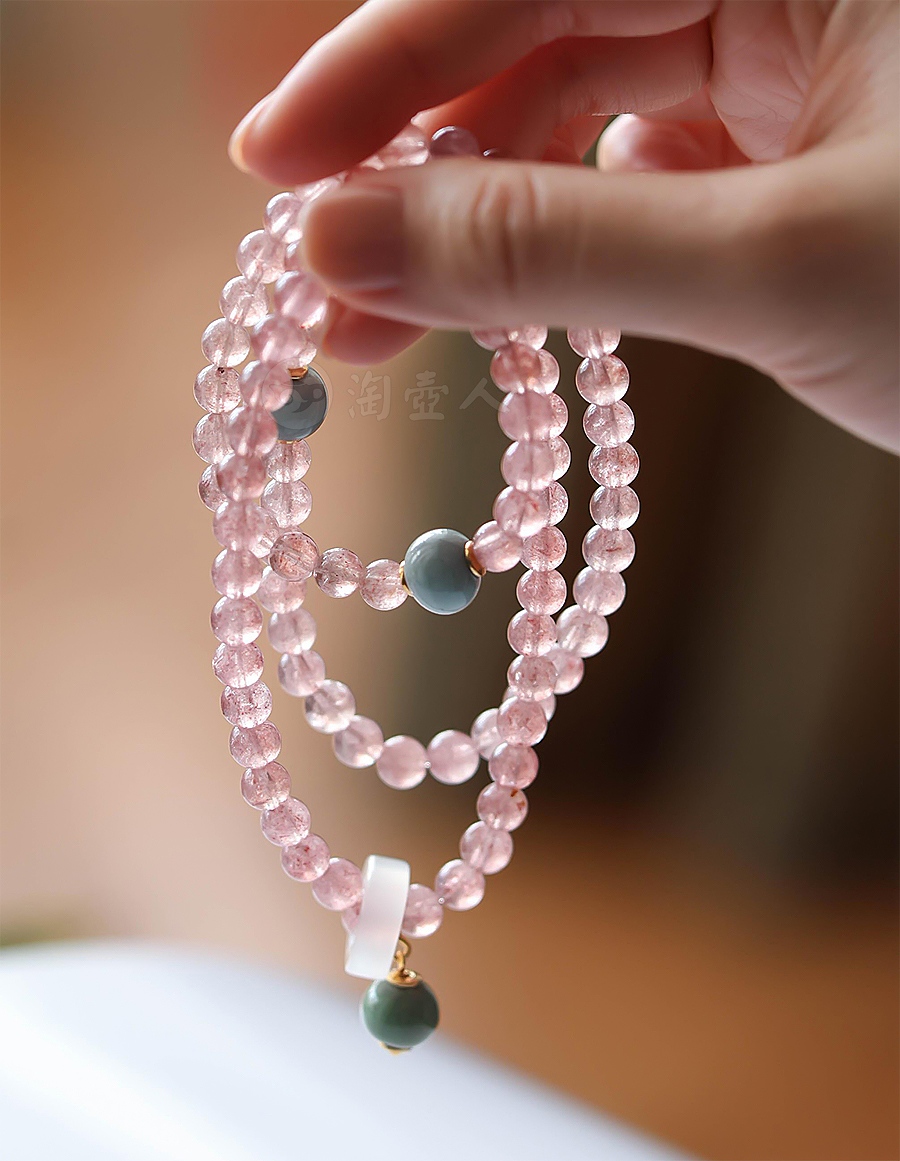 此桃之夭夭手串采用高定汝瓷珠与草莓晶制作,寓意“桃花开,爱与好运常在”。