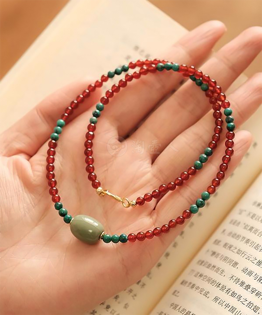 材质:高定15mm汝瓷桶珠、3mm绿松石、3mm红玛瑙;设计理念:梦华雅韵,知瓷风华。