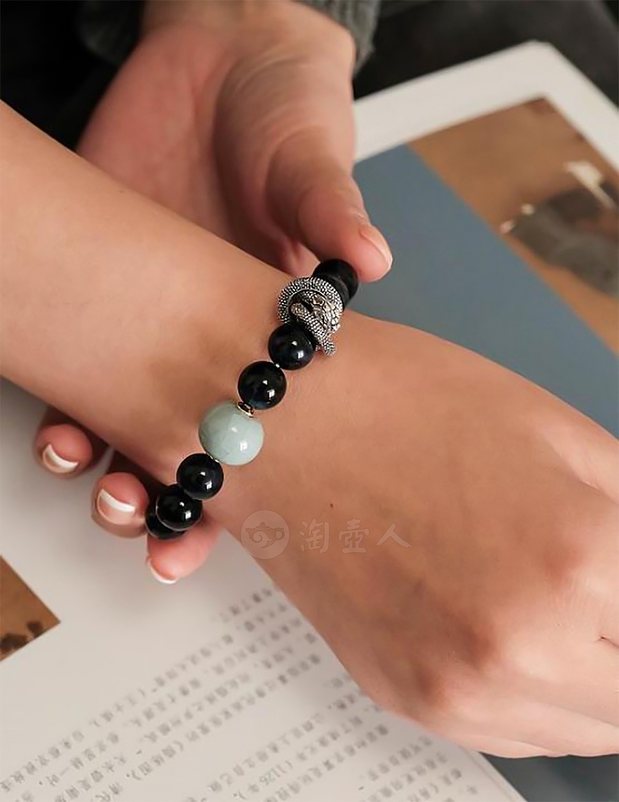 材质:高定14mm汝瓷珠、10mm蓝虎眼石、三圈铜蛇环;设计理念:灵蛇环饰,祥瑞点睛。