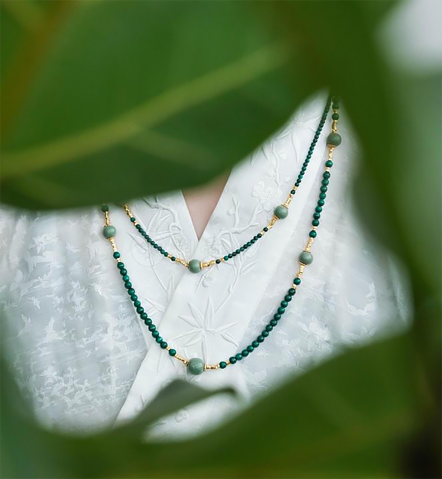 材质:14mm汝瓷珠、5mm/3mm孔雀石、2.7mm金三角;设计理念:温润如玉的汝瓷珠,苍翠欲滴的孔雀石,都给炎炎夏日带来一丝清爽。此作品曾于2024年黄河流域非遗作品创意大赛中斩获时尚创新大奖。
