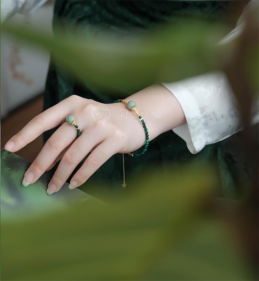 材质:10mm汝瓷珠、3mm孔雀石、2.7mm金三角;设计理念:温润如玉的汝瓷珠,苍翠欲滴的孔雀石,都给炎炎夏日带来一丝清爽。