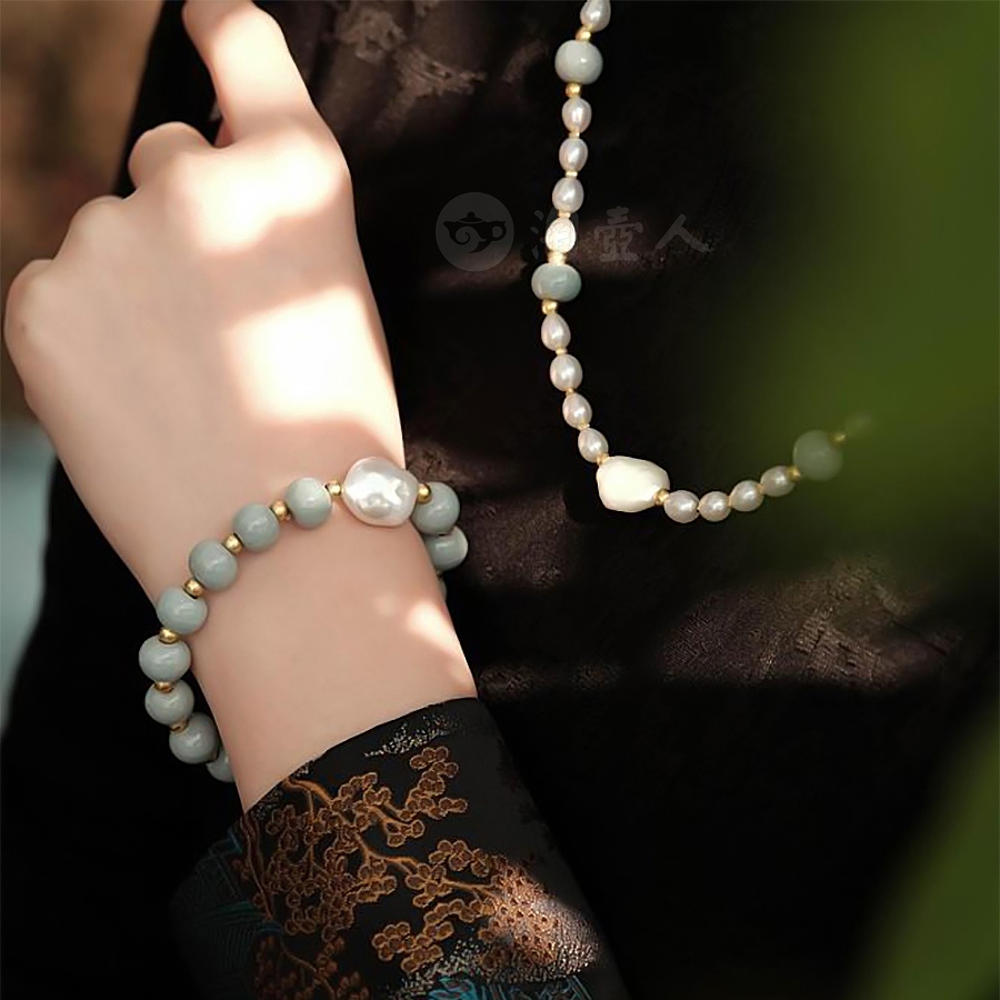 材质:10mm汝瓷珠、4mm镀金珠、异形珍珠。设计理念:美人鱼的眼泪,汝瓷的沉静、异形珍珠的哀婉动人、镀金珠的点点星辉,共同编织出一个关于人鱼、思念与永恒之泪的海洋深处的诗意篇章,冰冷的材质蕴藏着有温度的故事。