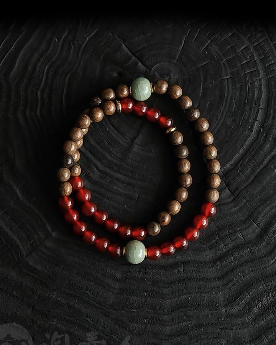 材质:高定10mm汝瓷珠、6mm金丝楠、6mm红玛瑙。设计理念:木与石之间,看万物生长,以大地之木对话亘古之石,在双层缠绕的腕间,见证一场静默而蓬勃的万物生长仪式。