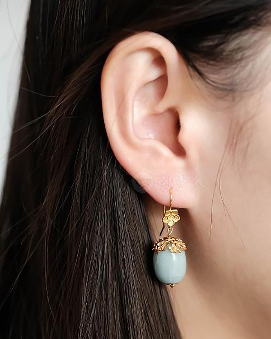 材质:高定15mm汝瓷桶珠、梅花银镀金耳钩、梅花银镀金花托。将汝瓷的纯净古韵与镀金银饰的精致感完美融合,于不经意间散发如暗香浮动的含蓄东方风韵,佩戴间尽显清雅脱俗的气质与匠心独运的艺术美感,动静皆宜。