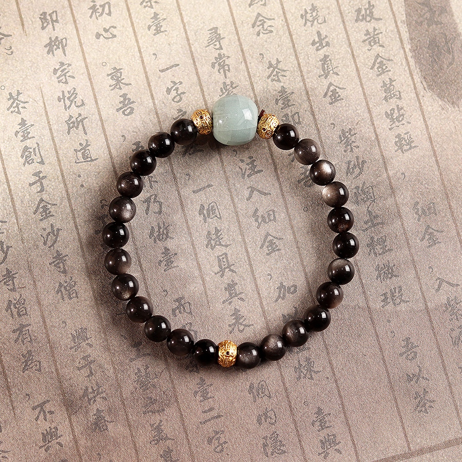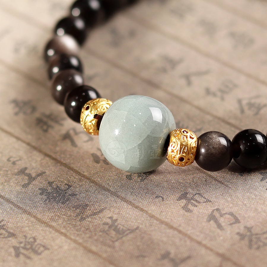 材质:银耀石、花纹款金色隔珠、汝瓷珠。设计理念:银耀点睛,金墨入魂。银耀石的冷峻深邃、汝瓷的温润内敛与金隔珠的流光溢彩交相辉映,碰撞出刚柔并济的独特美感,佩戴于腕间,尽显低调而富有内涵的东方韵味与现代轻奢格调。