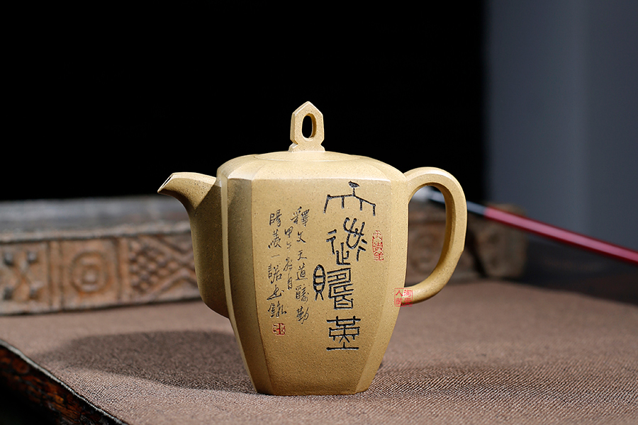 一弯流上平下圆,嗉部丰硕,贴于壶身,棱方耳把曲度和谐,端握舒适,流、把折角极细,与壶身相衬。壶身由张睿陶刻装饰,正面以石刻文字镌有“天道酬勤”四字,旁刻“释文天道酬勤”,并落款“甲午冬月 阳羡一诺书镌”,反面刻绘山水风景,峰峦耸峙,草木丰茂,境界清旷怡人。此壶器型古朴风雅,简练大方,将方与圆调和得恰到好处,使得整器既有方器的刚正挺直、棱角分明,也体现出圆器的顺畅、柔和。