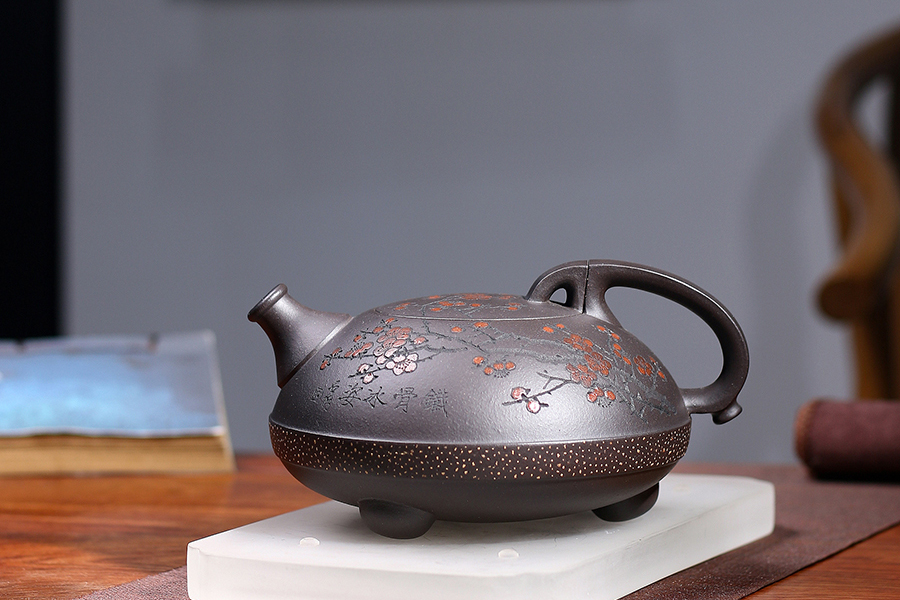 沈汉生大师自制自刻,壶身壶盖陶刻盛放的红梅,梅枝昂扬向上,在古拙的紫黑泥壶上,黑与红,碰撞出不一样的美丽。壶体钤刻“铁骨冰姿”,落款“石羽”。整器线条流畅,壶风古雅端庄,宝器荐藏!