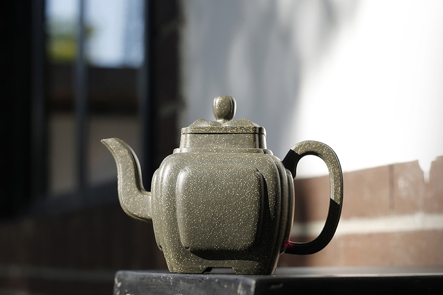 这把“菱花夺魁”壶,是邵顺生老师设计制作的专利(专利号ZL2009 3 0065383.0)作品,曾获省工美、省陶协优秀奖,壶体高而挺,君子四方,坦荡开阔。壶盖上以凹凸有致的四方菱花修饰,堆塑自然;枣型壶钮线条勾勒,饱满有神。流把线条流畅润泽,壶身四面层叠线面修饰,只觉层次分明,线面清晰,此壶实在是方器之中的精品!