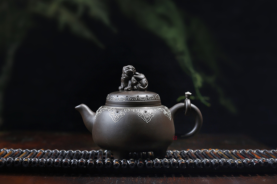 查看作品精选原一厂老黑料作胎,泥料极其珍贵,泥色稳重大方,端庄古雅,古味浓厚。盖面塑以一只灵兽为钮,造型憨态可人,目光炯炯有神。盖沿、壶肩的如意纹饰均采用嵌银丝工艺,对称分布,工艺精良,且银丝高出壶面,凸在壶体,立体感十足,并以强烈的色调对比,体现物象的精神,展现紫砂陶的装饰美感。 点睛之笔在于壶把饰以一环装饰,并嵌以莫桑石,高硬度使它不宜被刮花和开裂,能长久保存。