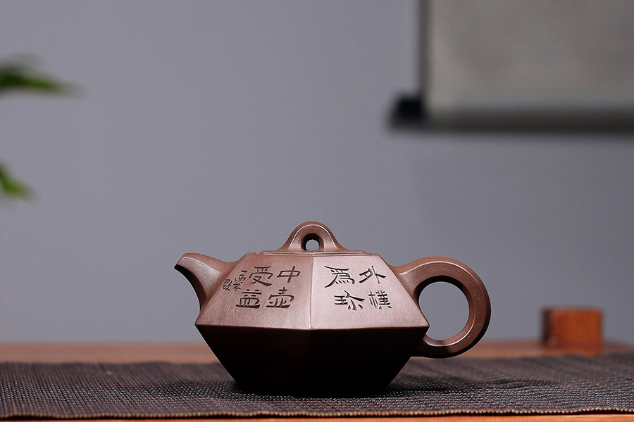 壶身由毛国强陶刻装饰,一侧书铭“外朴为珍,中壶受益”,落款“一粟题”,书法古朴有力,刀功精湛;另一侧陶刻一幅山水风景图,意境辽阔悠远。此壶为双大师强强联袂演绎经典作品,极具收藏价值。