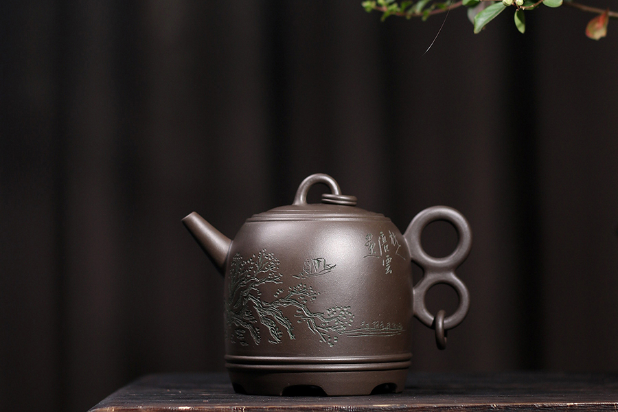 壶身正面饰一幅水岸村树图,侧书“杭人唐云画”,反面镌刻诗圣杜甫《小寒食舟中作》一诗的名句“春水船如天上坐,老年花似雾中看”,落款“唐云”,乃是由著名海派画家唐云书画后,再以笔刀精心刻就。整壶体现了自然中求变化、继承中有发展,成功地将现代意识流与传统审美观相结合,值得收藏品赏。