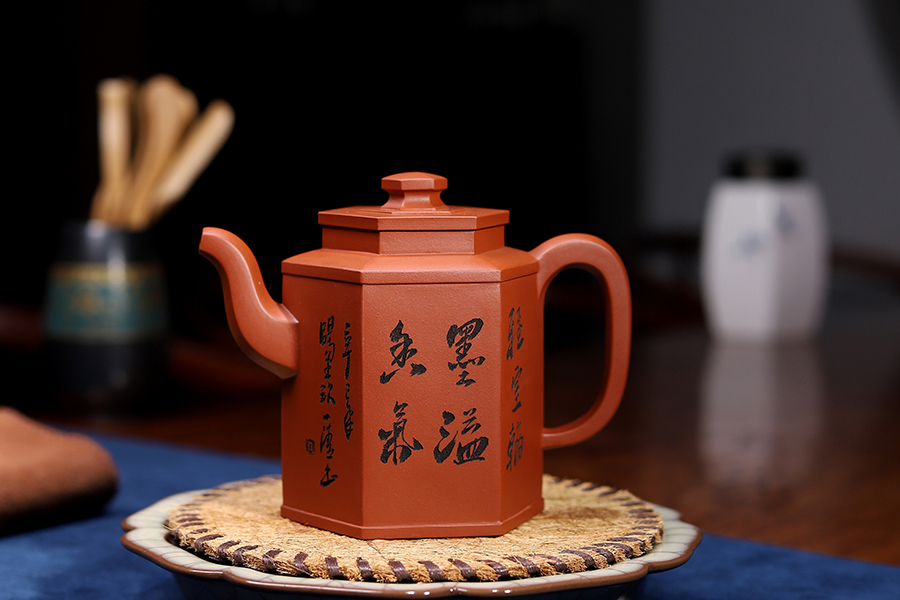 查看作品此壶作于2001年,为庄玉林、陈依群夫妇合制的经典方器,精选原矿清水泥作胎,泥色明润雅丽。整壶以六方为型,壶身呈六棱柱型,身筒高挺端正。钮、盖与壶体之形相称,六方线条层层相迭。流、把以棱线饰之,线面之间挺括平整,弯流高高昂起,造型优雅,大耳把气宇轩扬,把握舒适。