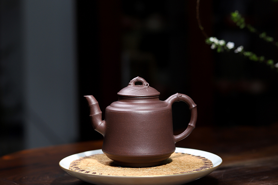 查看作品竹向来是紫砂创作中不可缺少的元素,此件高竹节壶,便是范建华以竹为题材创作,采原矿紫泥为胎,泥色紫润,气韵生动。柱状身筒高而立挺,圆肩束腰,底沿宽展,向下渐敛为假底圆足,线条变换流畅,故丝毫不显呆板,壶口收小,盎盖沿子母线与之密合,竹段虬曲作钮,竹叶自钮清浅续出,贴于盖面装饰。