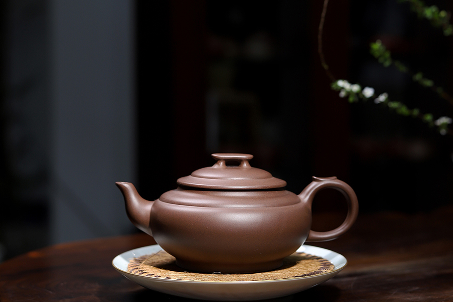 鸽颈式曲流胥出自然,环状柄上设有一方平台,持壶时可用于安放拇指,又似一叶小舟缓缓驶向桥钮,结构上呼应有致,真可谓匠心独运。整器通过提炼、简化的形体,古朴、淳厚的质感,写意地展现出江南水乡的恬静与柔情,回味无穷,耐人品赏。
