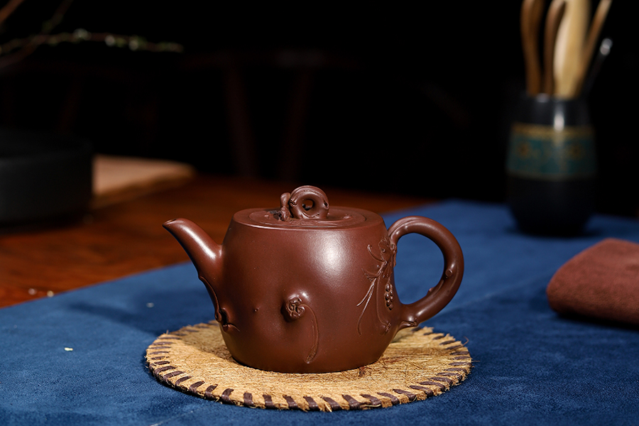 查看作品作者擅长摹古花塑器,此壶为作者选用原矿老紫泥精制而成,泥色古朴雅致,整器造型别致。壶身以葡萄树桩为形,钮如葡萄藤卷曲而成,生出枝叶与果实,贴塑于盖面,旁作一松鼠戏于其上,悠闲自得,似乎在觅食。流、把以葡萄藤作为装饰,形态优美。藤把枝叶蔓延至壶面,结出果实,壶身另一侧,又一松鼠攀附其上,活灵活现。此壶将自然界动植物与紫砂艺术相融,绘制出一幅生动形象的自然意趣,品茶之时,仿佛来到另一片天地,好不惬意!整壶制作精美,是一把欣赏、把玩、实用的花塑器佳作,值得收藏。