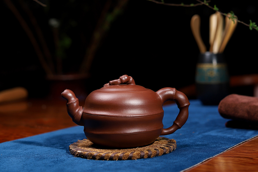 作者以竹入壶,选用原矿紫泥作胎,全手工制成此《笙歌壶》,胎体轻盈,泥色温润淳厚,彰显竹之雅韵。圆形壶身似竹筒之形,繁而不乱的线条,勾勒出竹之自然意趣。流、把、钮均以竹节装饰,浑圆挺括,弯流胥出,飒爽有力,耳把均势而起,弯曲之中见力度。盖上塑一竹节,虬曲成钮,生出枝叶贴塑壶面,气韵生动。整壶于传统中施新意,以粗犷有力的造型,展现竹之雄浑苍劲,刚柔并济,兼具观赏性和实用性。