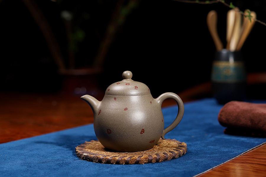此壶为作者精选原矿老青段泥,运用传统技法,全手工制作而成,泥料纯正,色泽古朴清丽。整体造型经典雅致,壶体饱满莹润,截盖与壶口浑然一体,身若一只秋梨,精巧可爱。圆钮点缀于壶盖,玲珑别致,揭拿便利。弯流优雅胥出,出水爽利,耳把端庄秀美,彰显成熟韵味。不规则的嵌泥装饰,平添俏皮之气。整壶线条流畅,一气呵成,工艺精湛,神形兼备,230cc实用性强,手感舒适,值得把玩。