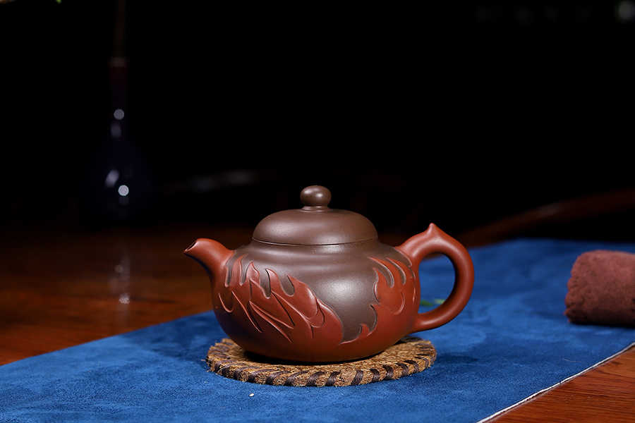 此器是老师经典代表作之一,极富表现力。壶身呈扁圆状,形体饱满、光滑细致,精选原矿紫泥,成色稳重;壶肩坡度平缓,增加了层次感,压盖鼓起,与饱满的壶身相照应,圆珠钮更添趣味。最可贵的是,壶腹贴一层底槽清泥料且勾勒出火焰形态,色泽鲜亮,动感十足,似有熊熊烈火包裹壶身,表现出紫砂壶浴火重生的寓意,且与主题相合;一变嘴,耳形飞把与壶身呼应。