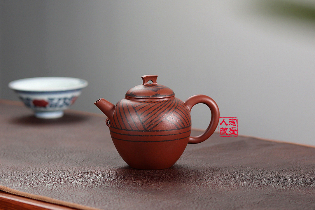 此件坤灵壶为余伟辉融合红山文化彩陶艺术精髓,突破紫砂壶传统形制桎梏,原创设计所得,采家藏优质黄龙山原矿红皮龙,全手工精制,造型仿【带盖彩陶瓮】而作,小口圆肩,鼓腹顺势下收,底呈内凹之形,器型端庄稳重,尽显上古器物的雄浑气韵。盎盖与口部合缝,将古瓮的系钮元素放大重构,化为壶钮,既保留文化基因,又赋予实用功能,巧思独具,直流挺拔利落,圈把圆润趁手,二者比例协调,握感与出水体验俱佳,流下增设系耳,细节处呼应古器形制,更添古朴意趣。