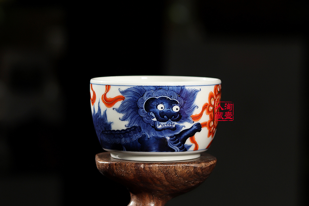 雄狮昂首摆尾、嬉戏宝珠的姿态跃然杯上,动静之间尽显灵动生机,青花的雅致与矾红的鲜活碰撞,既含传统工艺的厚重,又藏生活意趣,为品茗时光添一抹雅致风情。